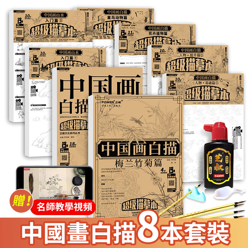 【贈8隻國畫毛筆+一得閣香墨汁+墨碟】國畫描摹 山水 人物 花卉 禽鳥 梅蘭竹菊 套裝淺印慢描,輕鬆掌握100種國畫技法,快速掌握經典筆法,技巧,控筆!