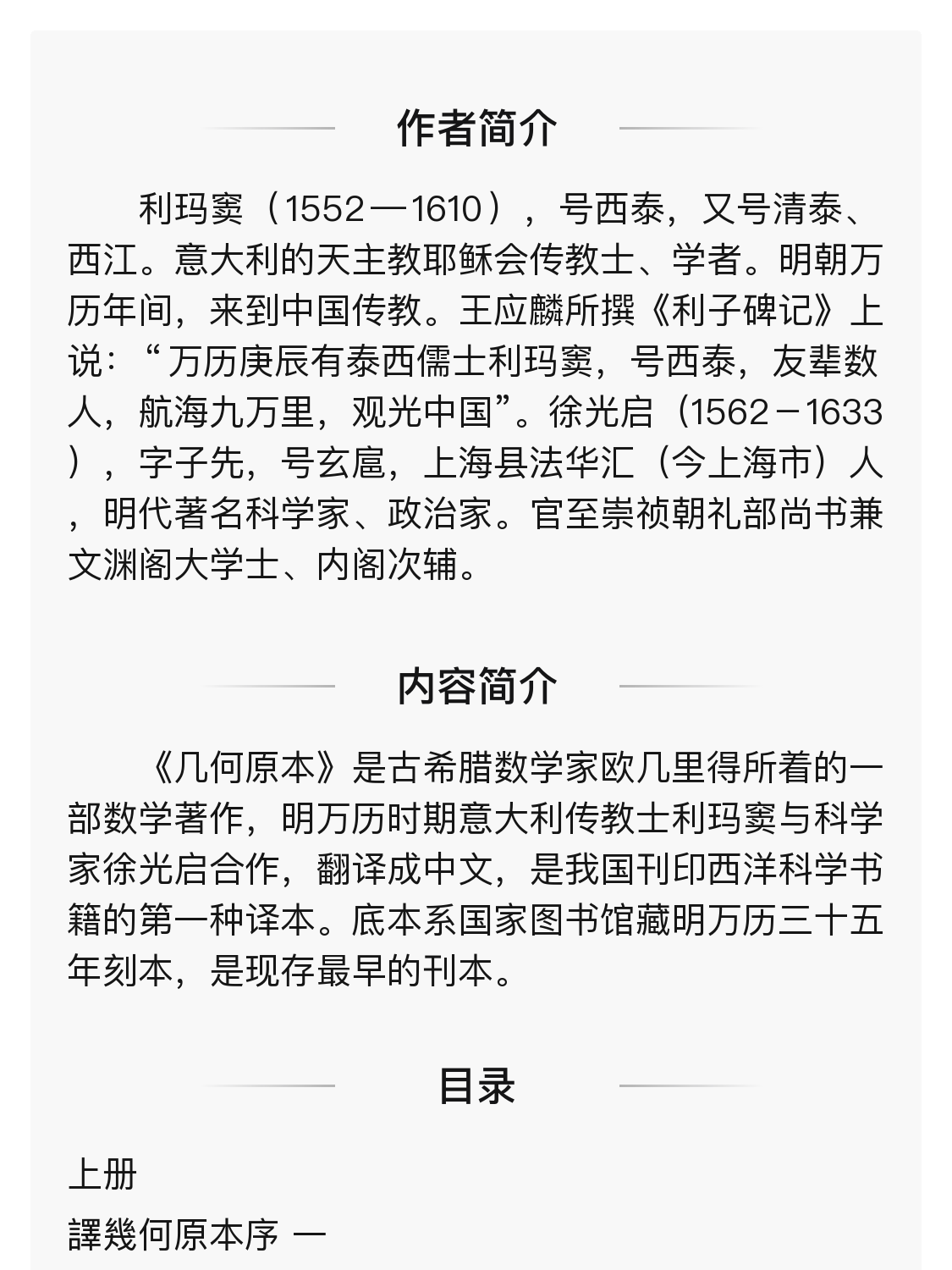 《幾何原本》是古希臘數學家歐幾里得所著的一部數學著作,明萬曆時期意大利傳教士利瑪竇與科學家徐光啟合作,翻譯成中文,是我國刊印西洋科學書籍的種譯本。底本系國家圖書館藏明萬曆三十五年刻本,是現存早的刊本。