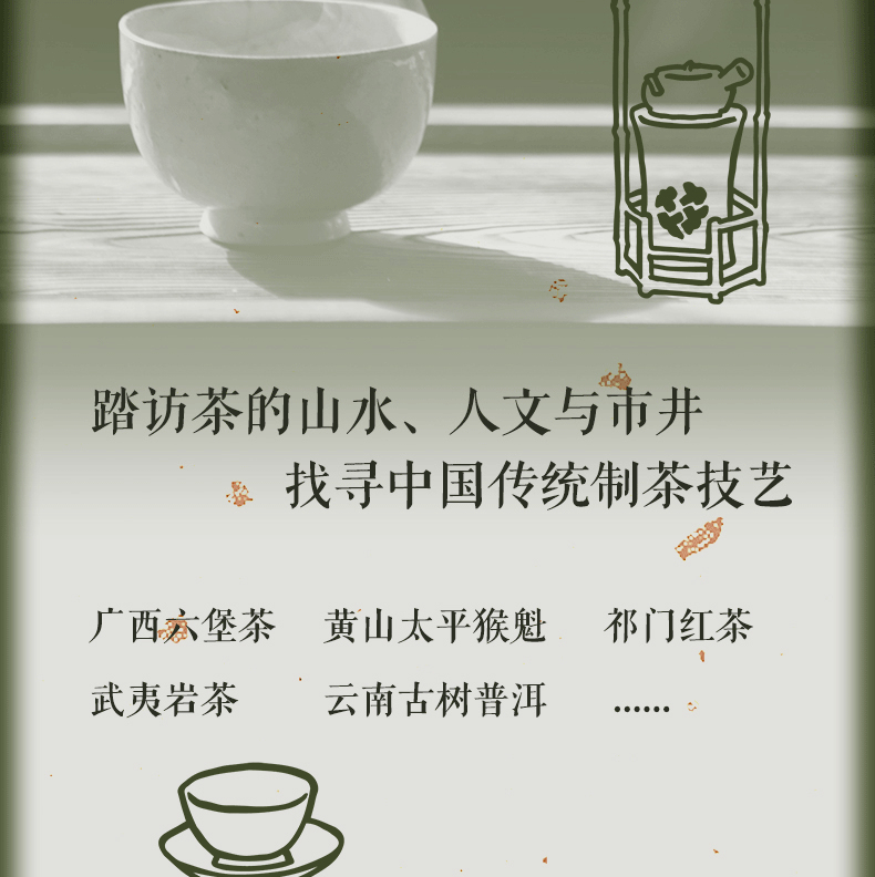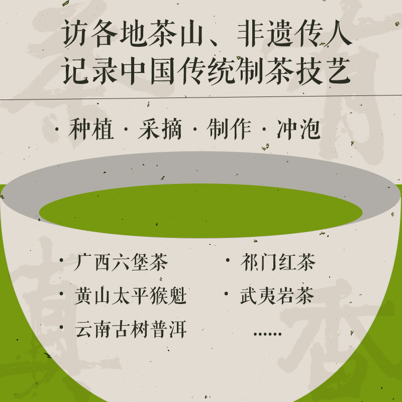 遍訪名叢,廣西六堡茶、黃山太平猴魁、祁門紅茶、武夷岩茶、雲南古樹普洱......尋訪非遺傳人,記錄中國茶珍貴的種植、採摘、製作與沖泡技藝。