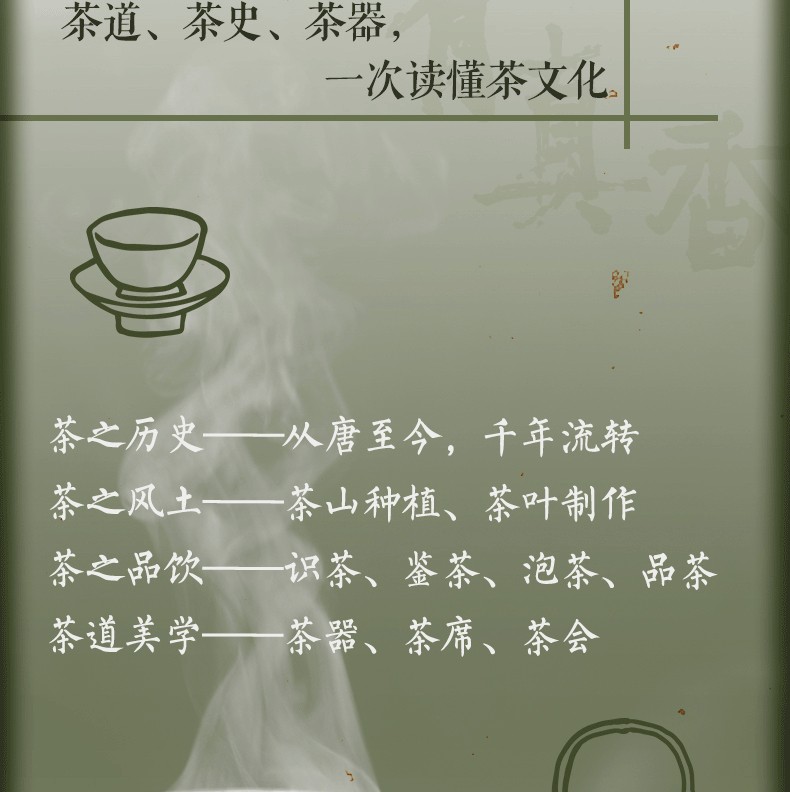包含茶之史、茶之風土、茶之製作、茶之器物、茶之沖泡、茶之禮儀。