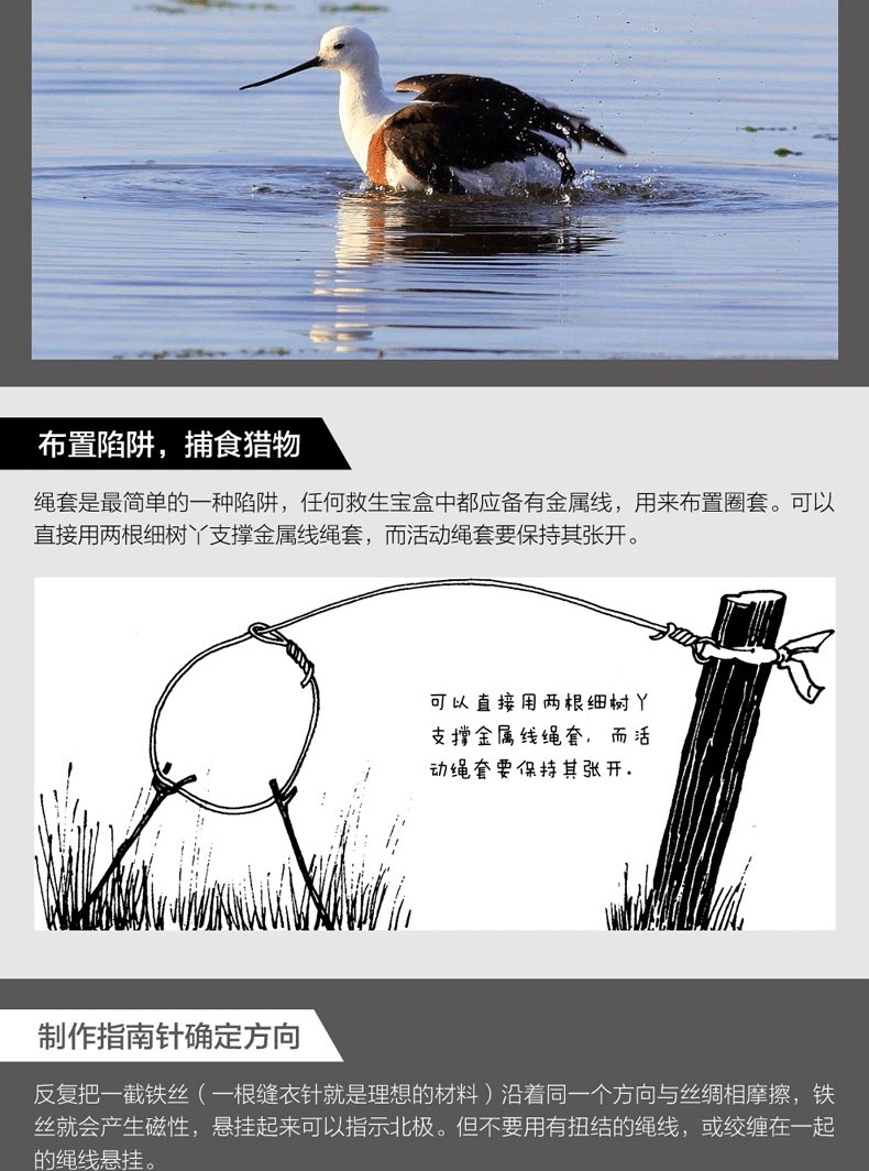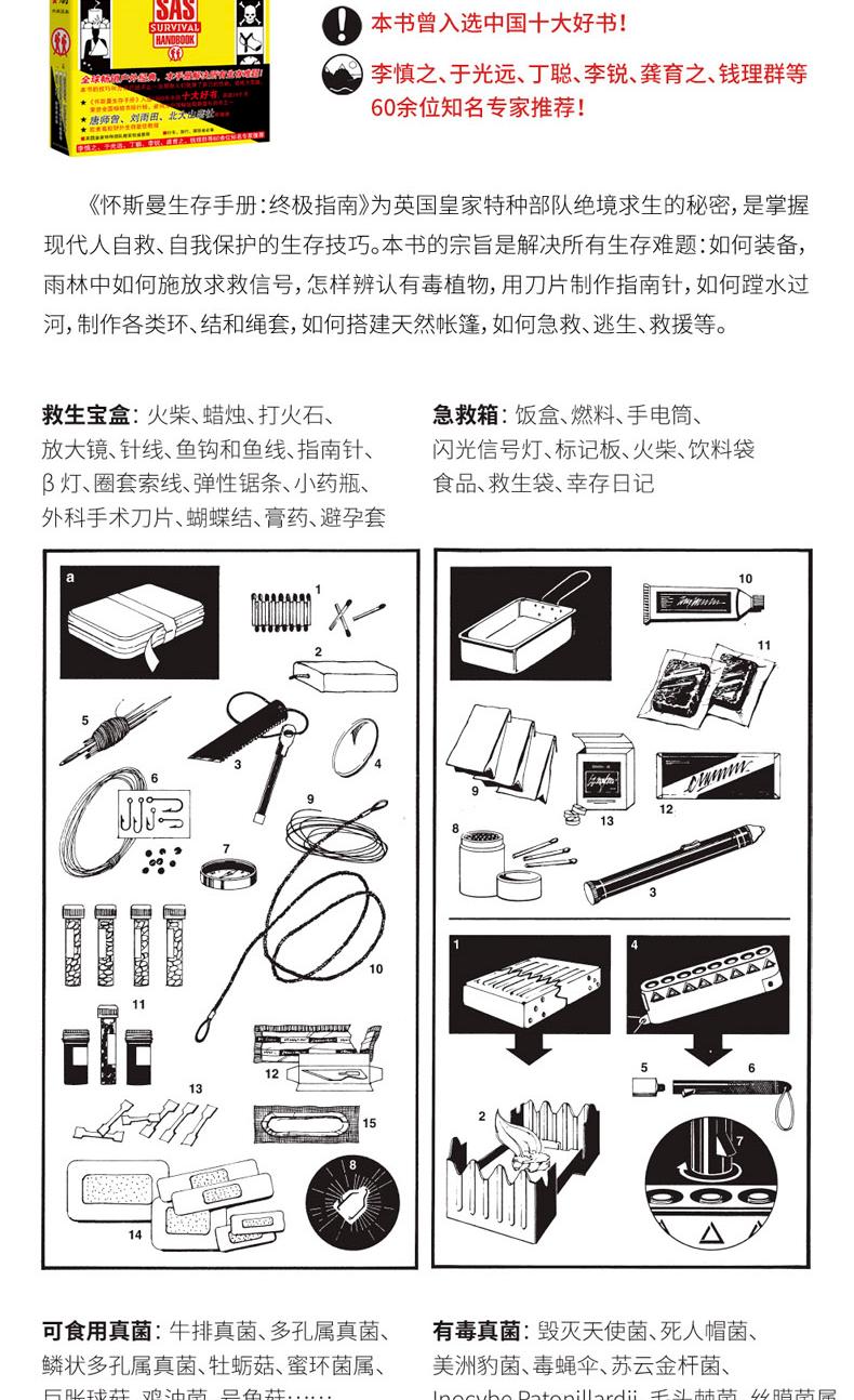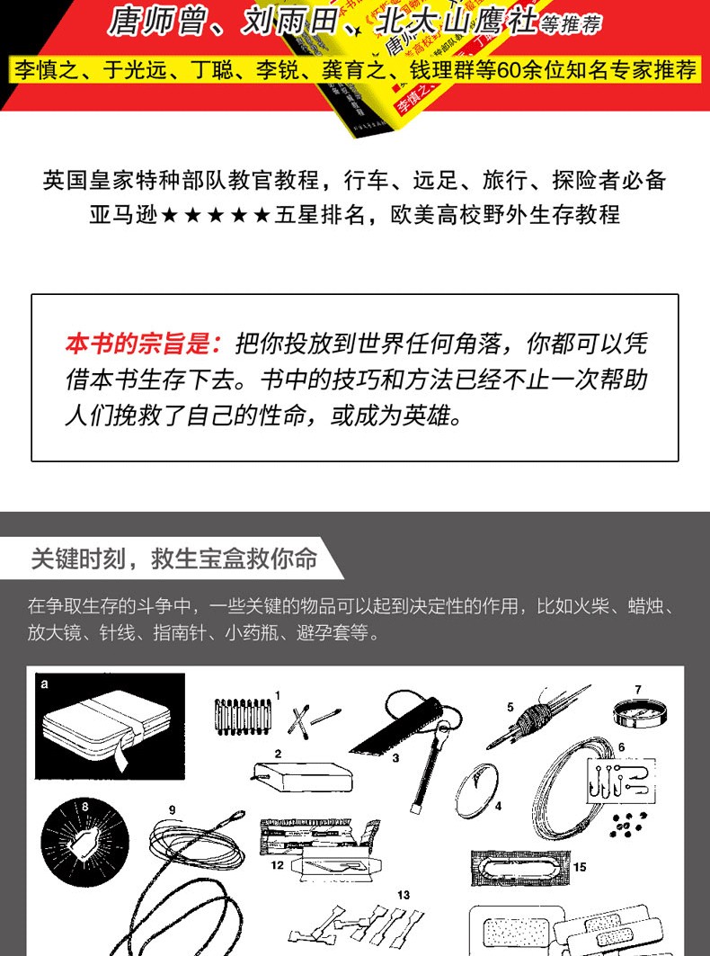 本書為英國皇家特種部隊絕境求生的秘密,是掌握現代人自救、自我保護的生存技巧。 書中永不過時的生存經驗、知識與技能,讓你無論何時何地遇到任何生存難題都能迎刃而解。 本書幾乎涵蓋所有戶外生存的解決方法,詳細講解各種戶外生存和自救技巧。 包括:求生裝備、如何發出求救訊號,如何辨認有毒植物,如何用刀片製作指南針,如何設置陷阱和捆綁獵物,如何捕魚,如何點燃潮濕的火柴,如何搭建天然帳篷,如何急救、逃生和救援等 。 針對水災、火災、地震等災難環境,講解如何控制自己的恐懼情緒,保持冷靜,靈活應對,並充分利用現有的資源脫離困境。 此外,書中也展示了許多求生場景和求生案例,並附有大量圖片,講解具體的操作步驟,增強了直覺性與實用性。
