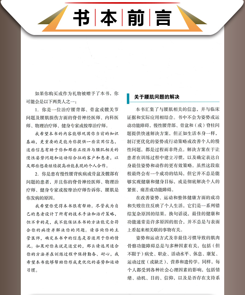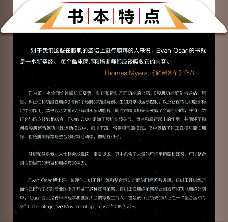 作為一本全面論述腰肌在姿勢、動作和運動方面功能的書籍,本書明確了腰肌的功能解剖、生物力學和運動控制,以及它在核心和髖部穩定中的作用。本書包含大量彩色解剖和運動圖片,同時對腰肌相關研做了全面的回顧。將此類研究與臨床經驗相結合,Evan Osar明確了腰肌在髖關節、骨盆和下背部中的作用,並闡述瞭如何將腰肌整合到功能性運動模式中,包括下蹲、弓步和彎曲模式。書中包括了糾正性和功能性訓練,將腰肌訓練策略整合到日常活動中,如站立和坐姿。