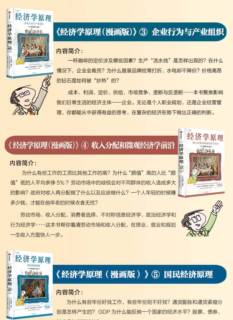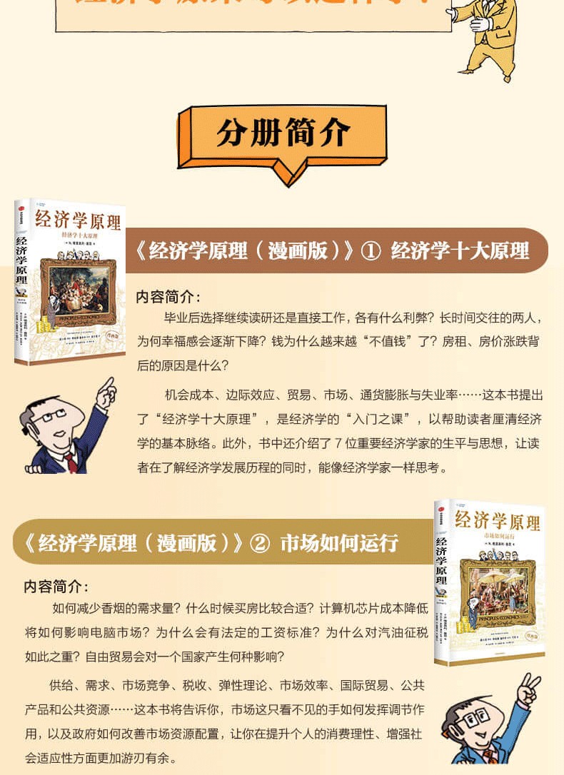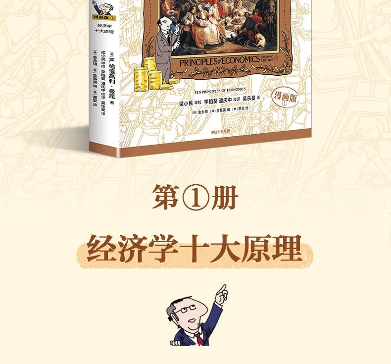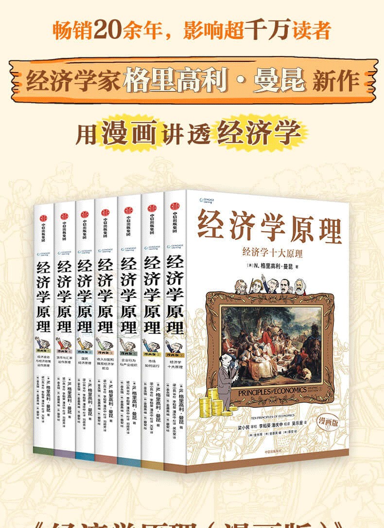 這套官方授權改編的《經濟學原理(漫畫版)》共7冊,涵蓋微觀經濟學和宏觀經濟學兩大知識領域,透過精美的插圖、生動有趣的討論和貼近生活的案例,對經濟學中的重要概念、原理及其在現實生活中的運用進行了通俗化的解釋。