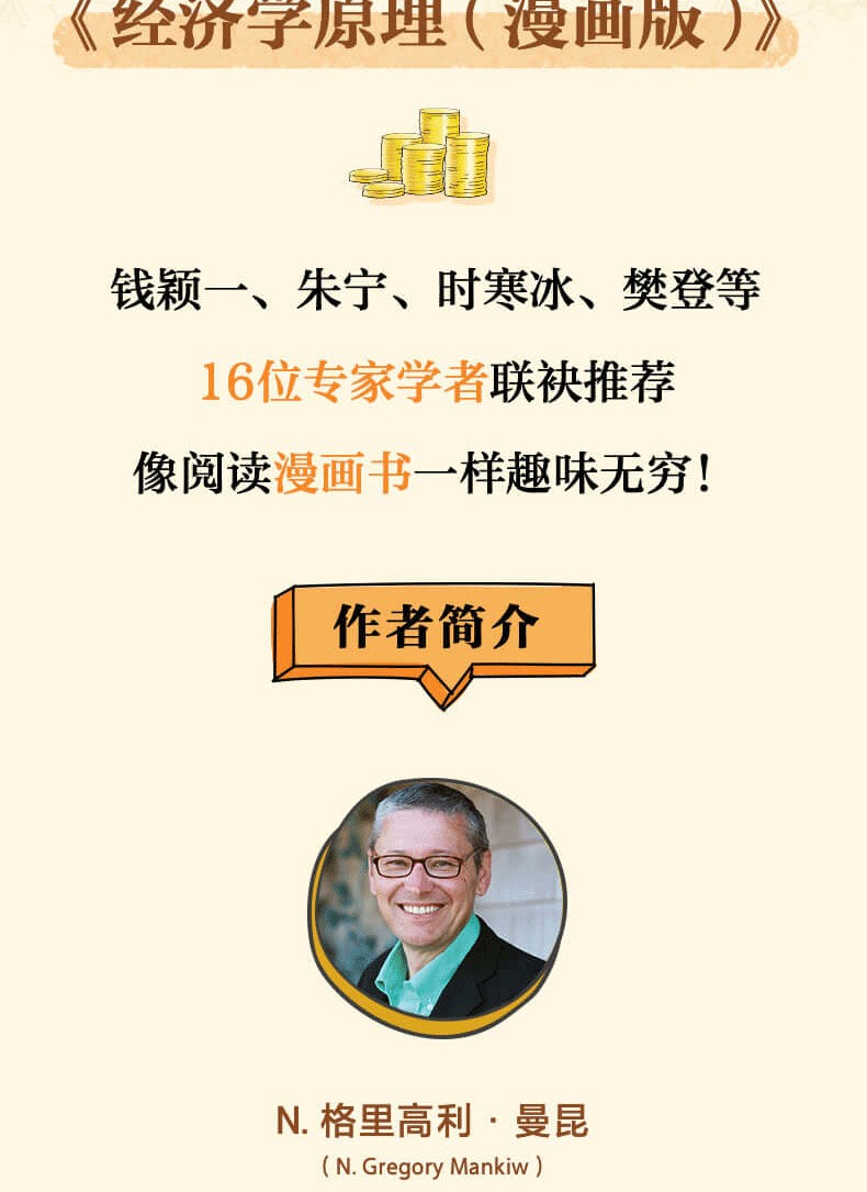 N. 格里高利‧曼昆,著,美國知名經濟學家,29 歲被評為哈佛大學經濟學終身教授,曾在普林斯頓大學和麻省理工學院學習經濟學,講授宏觀經濟學、微觀經濟學、統計學和經濟學原理等課程。
