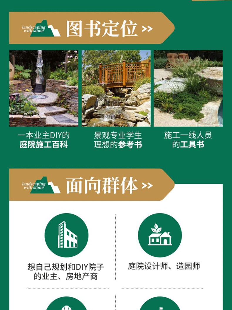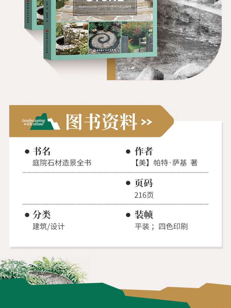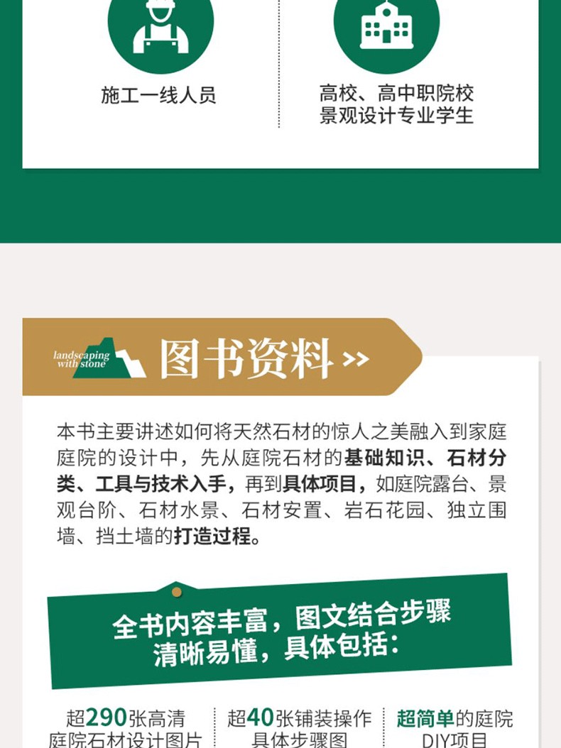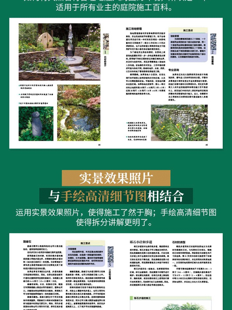 3.內容豐富,從石材切入,完美融合其他造景元素。本書雖是主要講石材,但關鍵點還是如何將天然石材合理地融入周圍的環境,是一本業主的DIY庭院施工百科。