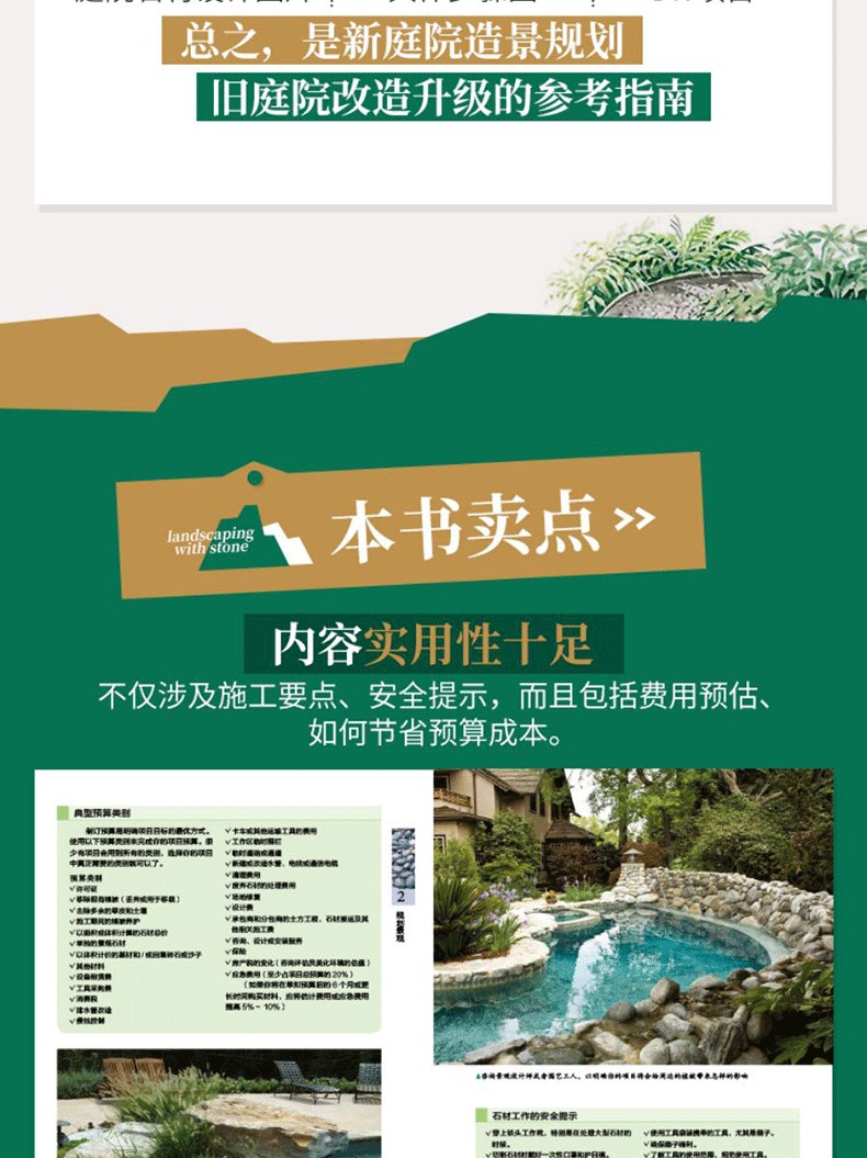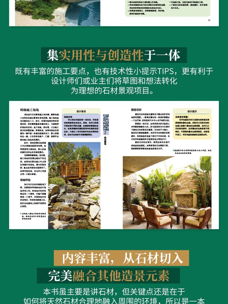 2.內容集實用性與創造性於一體。既有豐富的施工要點與技術性小提示tips,更有利於設計師們或業主們將草圖和想法轉化為理想的石材景觀項目。