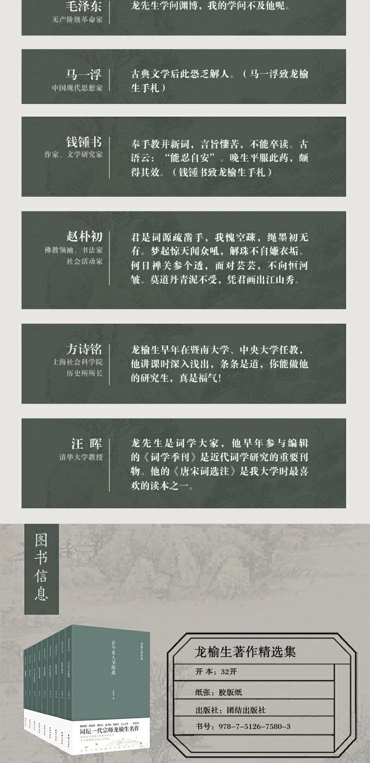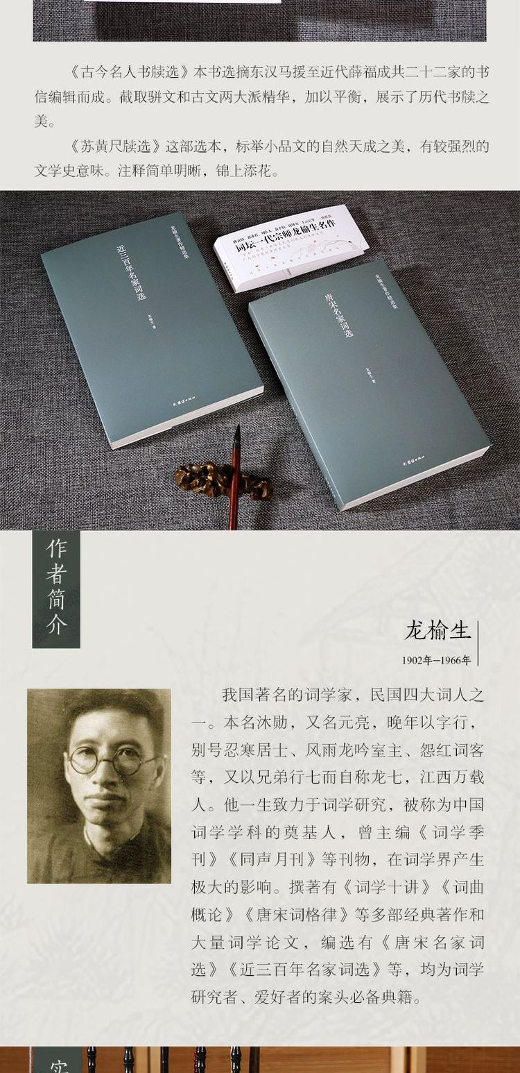這套《龍榆生著作精選集》我們精選了其經典著作九種。在概論中,我們選擇了他晚年有代表性的《唐宋詞格律》《詞曲概論》《詞學十講》三種;選本則選擇《東坡樂府箋》《唐宋名家詞選》《唐五代詞選注》《近三百年名家詞選》四種;考慮到目前雅言弱化、語言表現力不足的現狀,還特意選擇了《古今名人書牘選》《蘇黃尺牘選》二種,作為學習文言文的補充讀本。讀者也可以藉此九種窺見龍先生一生治學的全豹。