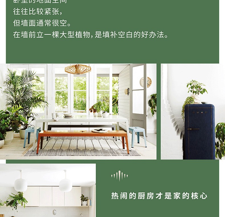 3. 案例輕鬆復刻,實用貼心!兩位作者將日常生活中可能遇到的問題,給出了實用的解決方案:空間不同,功能不同,植物的選擇和搭配也要各有特色:臥室的地面往往比較緊張,但牆面很空,立一棵高大的觀葉植物是填補空白的好點子,讓你在每天醒來時沐浴綠色的晨光;浴室實用卻無聊,是缺乏視覺焦點的小空間?不妨在浴室牆上吊掛空氣鳳梨,這種垂瀉而下的植物,很適合簡單的小空間……