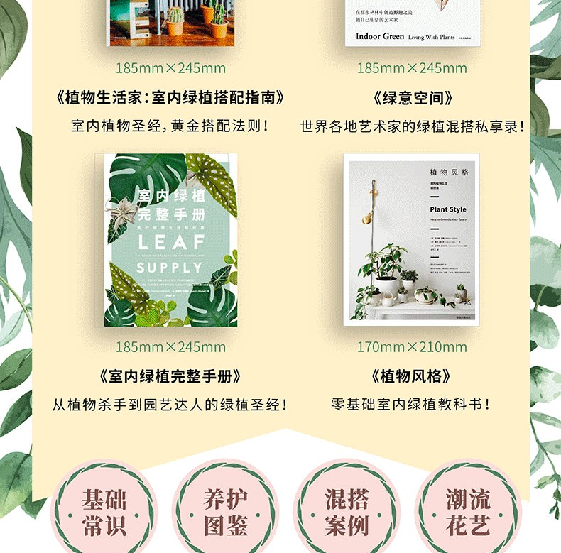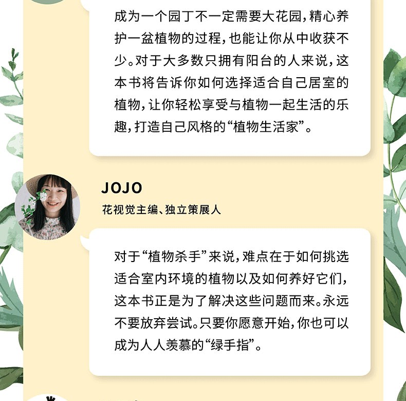 經典的室內綠植搭配指南,對植物挑選、養護、造型等方面進行了詳細闡述,並配有大量的精美圖片。在書中,植物造型師蘇菲·李展示了怎樣使用簡單而富有創意的方式,讓家居生活變得綠色而優雅。