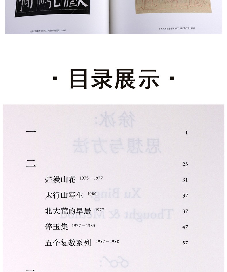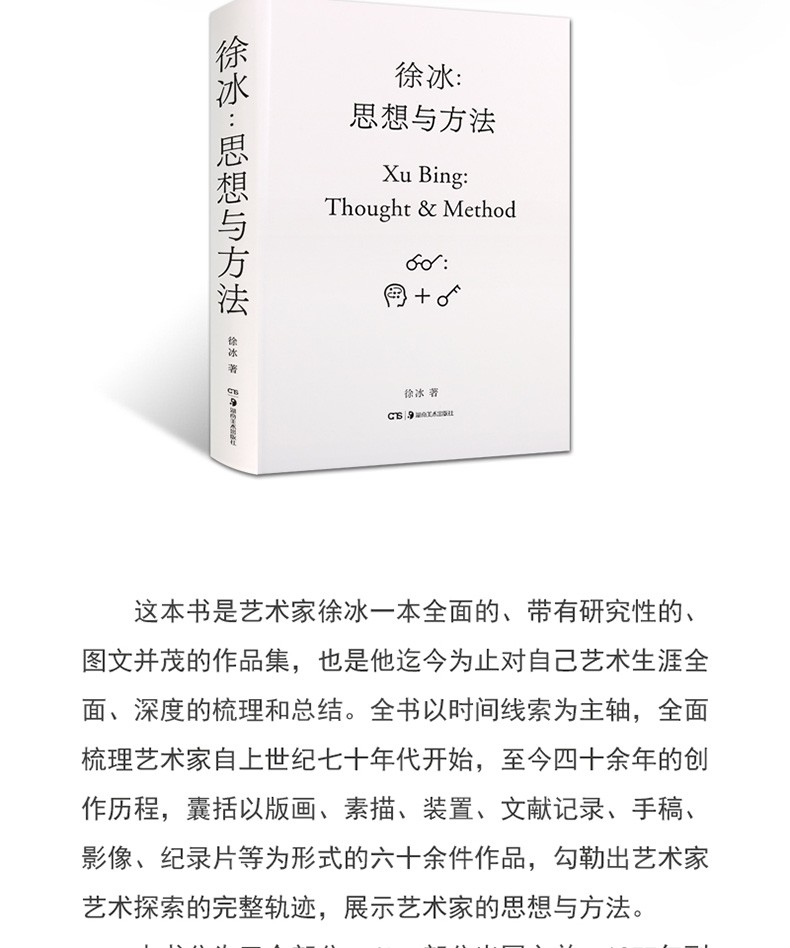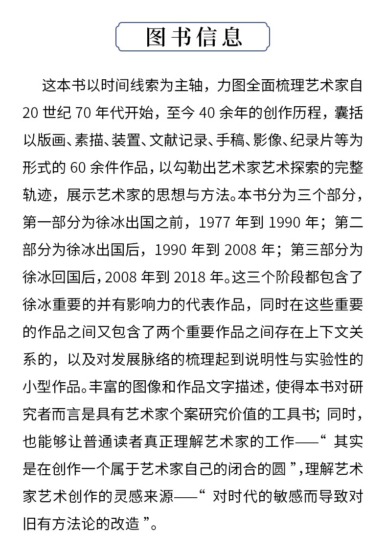 這本書是著名藝術家徐冰在國內第一本全面的、帶有研究性的、圖文並茂的作品集,也是他迄今為止對自己藝術生涯最全面、最深度的梳理和總結。 全書以時間線索為主軸,全面梳理藝術家自上世紀七十年代開始,至今四十餘年的創作歷程,囊括以版畫、素描、裝置、文獻記錄、手稿、影像、紀錄片等為形式的六十餘件 作品,勾勒出藝術家藝術探索的完整軌跡,展現藝術家的想法與方法。