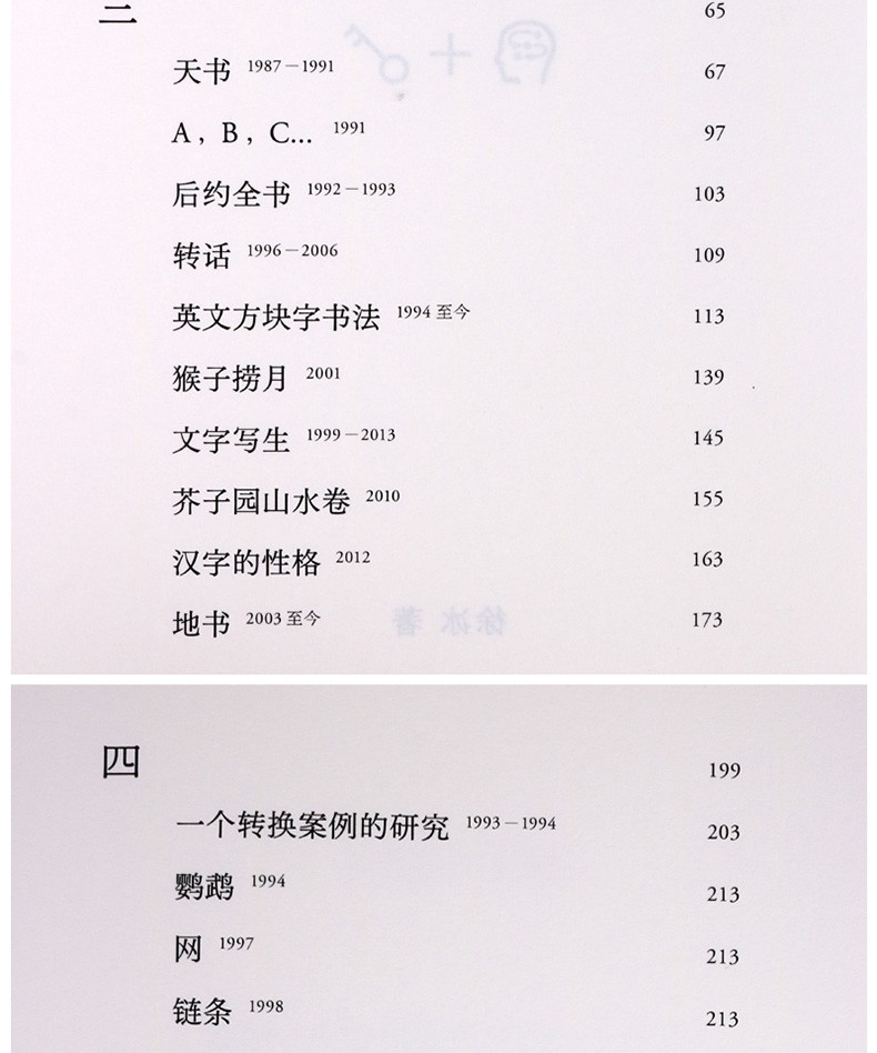 本書分為三個部分,第一部分出國前,1977年到1990年;第二部分出國後,1990年到2008年;第三部分回國後,2008年到2018年。 這三個階段都包含了徐冰重要的並有影響力的代表作品,同時在這些重要的作品之間又包含了兩個重要作品之間存在上下文關係的,以及對發展脈絡的梳理起到說明 性與實驗性的小型作品。