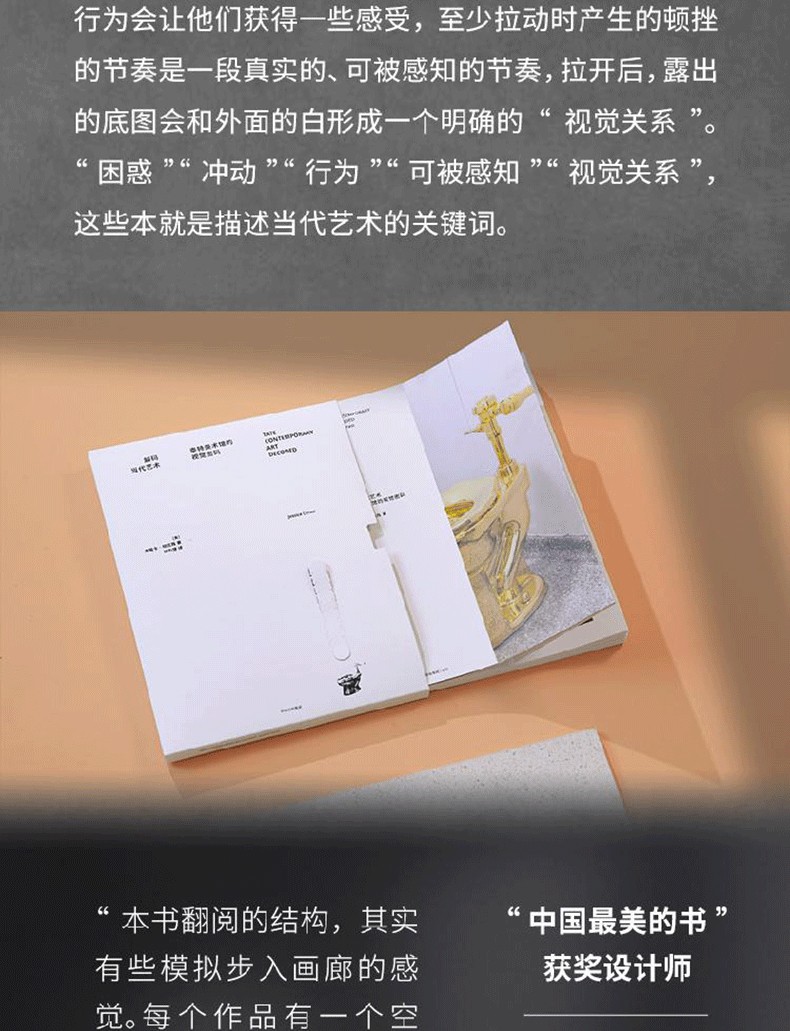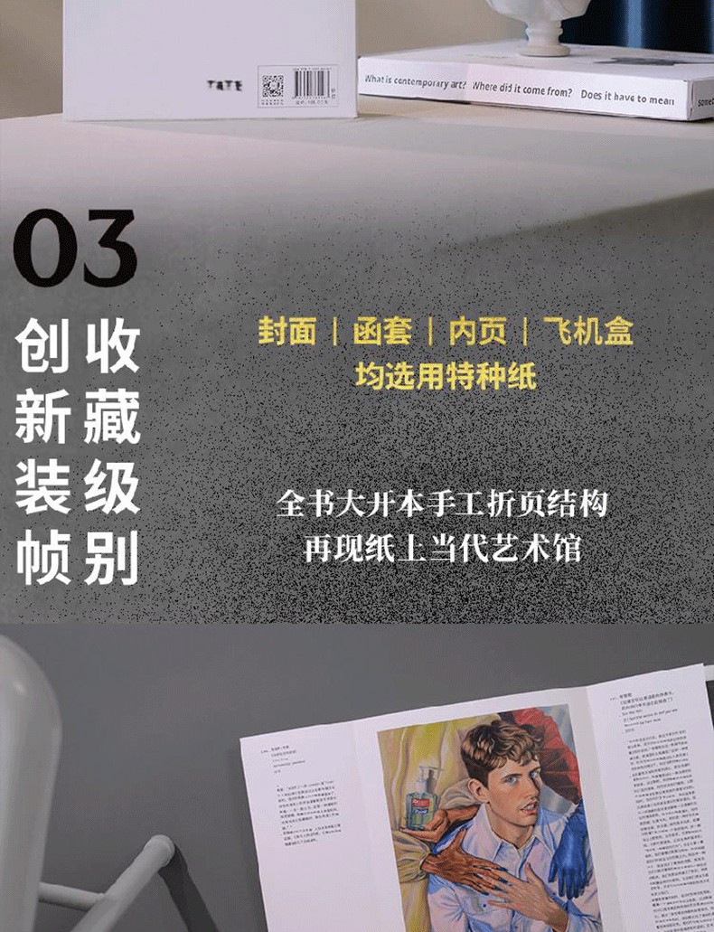 4.圖書製作工藝精妙,再現紙上當代藝術館,翻閱過程猶如徜徉於展覽空間中由「中國最美的書」獲獎設計師擔綱設計。精美的裝幀設計,新穎的拉鍊互動裝置,打開當代藝術之門!大開本手工摺頁結構,高難度大小套頁裝訂,每件作品有一個空間,更專注地欣賞藝術作品,再現紙上當代藝術館。