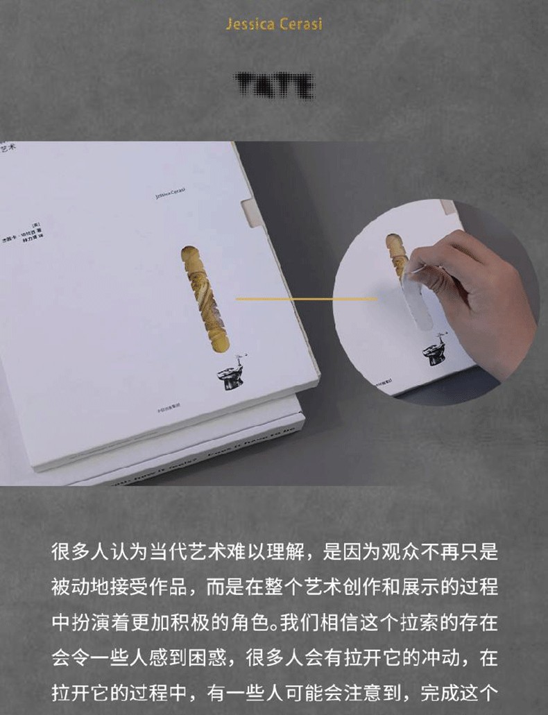 許多人認為當代藝術難以理解,是因為觀眾不再只是被動地接受作品,而是在整個藝術創作和展示的過程中扮演更積極的角色。我們相信這個拉索的存在會令一些人感到困惑,很多人會有拉開它的衝動,在拉開它的過程中,有一些人可能會注意到,完成這個行為會讓他們獲得一些感受,至少拉動時產生的頓挫的節奏是一段真實的、可被感知的節奏,拉開後,露出的底圖會和外面的白形成一個明確的「視覺關係」。 “困惑”“衝動”“行為”“可被感知”“視覺關係”,這些本來就是描述當代藝術的關鍵詞本書翻閱的結構,其實有些模擬步入圖庫的感覺。每個作品有一個空間,當翻開半頁,有點像是進入了一個展覽空間。