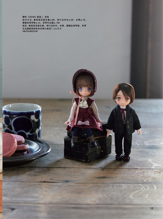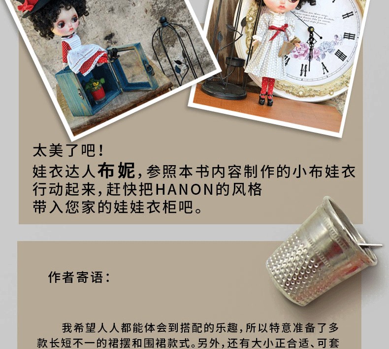 這是一本給娃娃做衣服的書,作品造型簡約,但是注重版型和細節設計,每款衣服的布料、配色、配飾都由娃衣設計大師藤井里美親自設計。她的娃衣品牌HANON更為知名,多次與多家知名娃娃品牌推出聯名款設計,很多娃友對藤井里美的名字很陌生,但是對HANON耳熟能詳。 HANON的作品配色大膽獨特,低調中顯露高貴,面料多天然材質,製作步驟比較簡單,易於互相搭配,具有自己獨特的設計風格。書裡的每款衣服都有S、M、L碼,分別適合給中布娃娃、小布娃娃和荒木少女,也可以試試給其他尺碼相近的娃娃穿著。書後附送裁剪用紙樣,描下後裁剪,就可以反複使用,也可當做基礎版,自行調整細節和尺寸。
