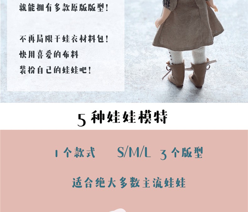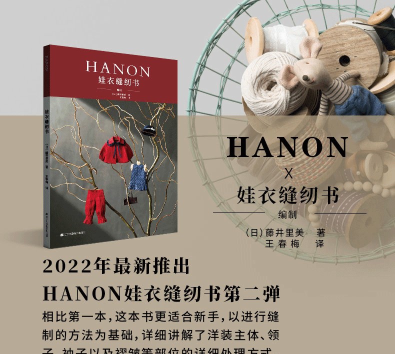 這是一本給娃娃做衣服的書,作品造型簡約,但是注重版型和細節設計,每款衣服的布料、配色、配飾都由娃衣設計大師藤井里美親自設計。她的娃衣品牌HANON為知名,多次與多家知名娃娃品牌推出聯名款設計,很多娃友對藤井里美的名字很陌生,但是對HANON耳熟能詳。 HANON的作品配色大膽獨特,低調中顯露高貴,面料多天然材質,製作步驟比較簡單,易於互相搭配,具有自己獨特的設計風格。書裡的每款衣服都有S、M、L碼,分別適合給中布娃娃、小布娃娃和荒木少女,也可以試試給其他尺碼相近的娃娃穿著。書後附送裁剪用紙樣,描下後裁剪,就可以反複使用,也可當做基礎版,自行調整細節和尺寸。
