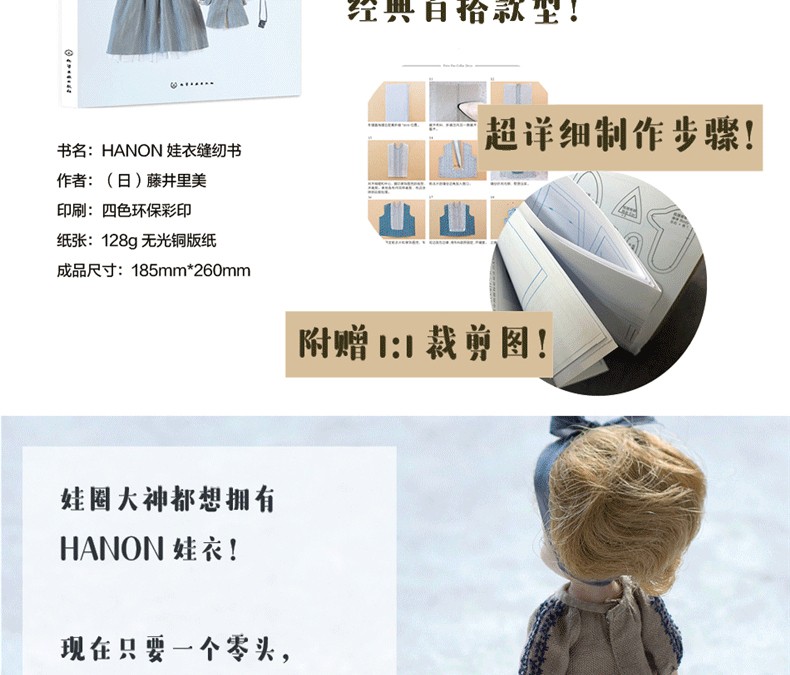 HANON娃衣是眾多娃迷們的夢想,現在你只需要一本書,就可以擁有HANON娃衣設計作品的多套1:1裁剪紙樣,和詳細的製作教程,而只花費不到一個紙樣材料的價格。