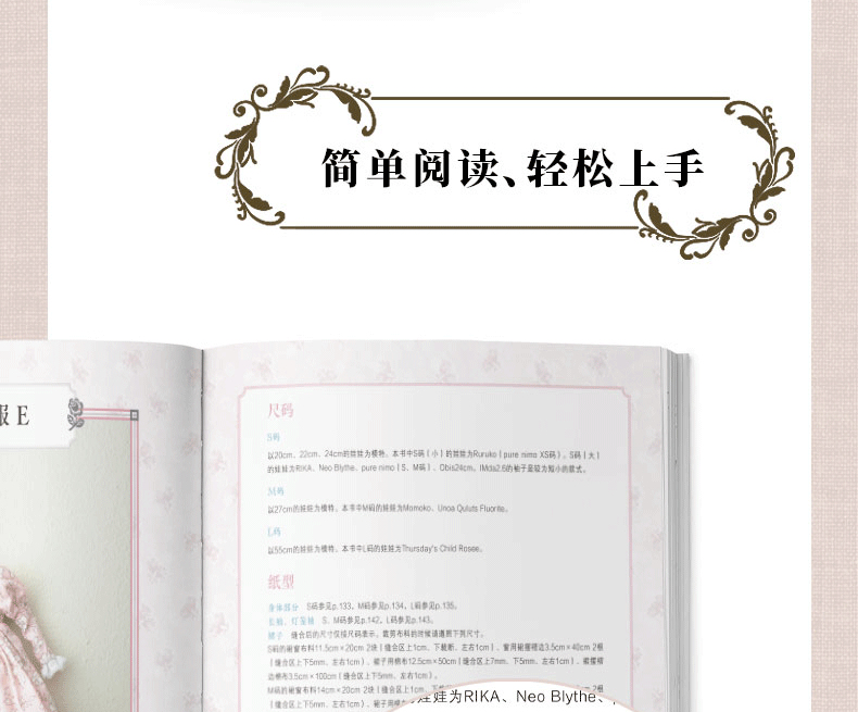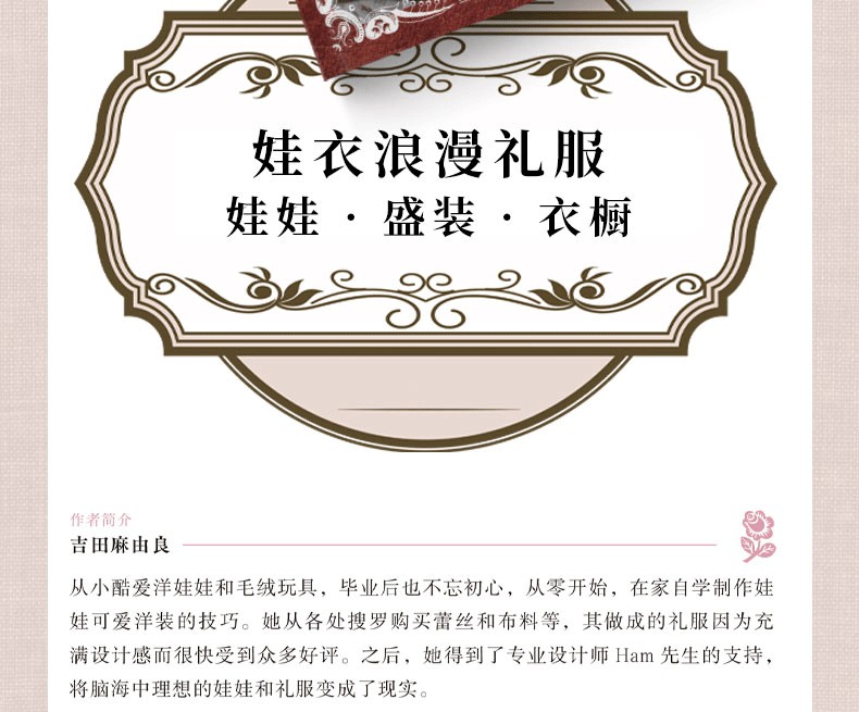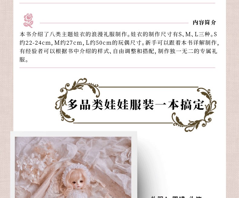 篇首語 在遇見讓我一見鍾情的娃娃之後,我入手了人生中的個娃娃。因為想給這個娃娃做衣服,所以來到書店購買相關圖書。我最初買到的娃娃服裝教程,就是浪漫禮服系列的作品。看著書來學習製作方法,就算看錯了紙型也可能歪打正著製作出世界上獨一無 二的禮服,這讓我欣喜不已。本書中介紹的製作方法,接近不需要復雜的技術和理論知識,流程合理、工藝 簡單。每一款都可以輕鬆地製作出來。與成.人的服裝不同,娃娃服裝無須清洗,也不會穿得很髒,所以製作過程盡可能簡單些、快樂些。這也是我在傳授製作娃娃服裝經驗時,時刻銘記......