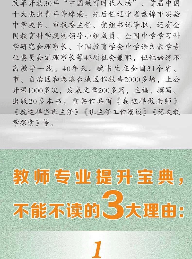 本書為著名教育家魏書生40年教壇經驗的心血之作。從教師修行、教學方法、班級管理三方面闡述自己的教學理念,提出教書與育人並重,教師與學生一起成長。同時,作者根據自己多年的教學實踐,提出許多影響深遠的實戰教學技法,也總結出許多廣為流傳的學習方法。班主任工作管理方面,則強調培養學生的自我管理能力,輕輕鬆鬆做班主任。魏書生的教學方法和管理經驗,經過了多年的實踐打磨與不斷完善,許多都成為教育界口耳相傳的經典法則,讓一代又一代教師*凡走向卓越。