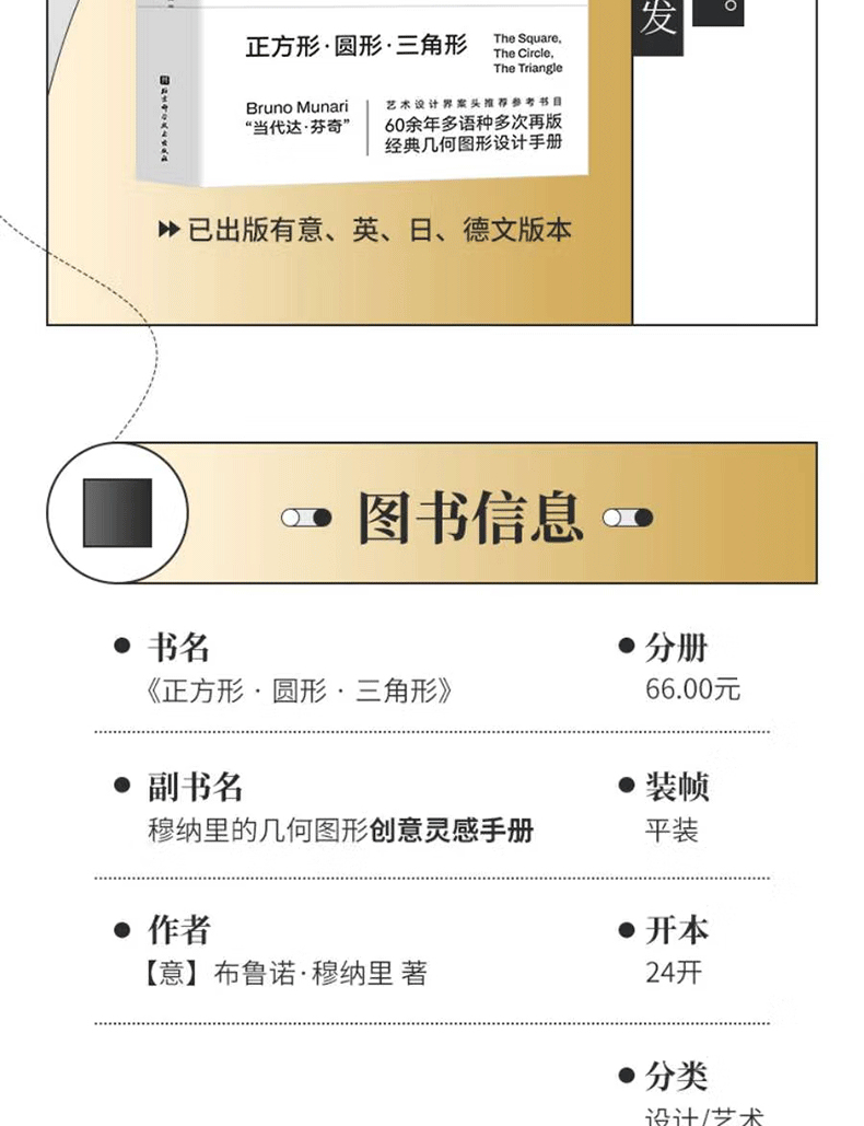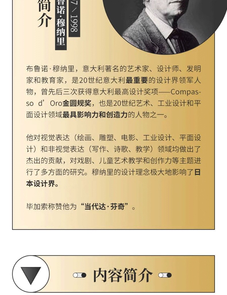 [意]布魯諾·穆納裡(1907-1998),義大利著名的藝術家、設計師、發明家和教育家。是20世紀義大利重要的設計界領導人物,也是20世紀藝術、工業設計和平面設計領域有影響力的人物之一。他對視覺表達(繪畫、雕塑、電影、工業設計、平面設計)和非視覺表達(寫作、詩歌、教學)領域均做出了傑出的貢獻。對戲劇、兒童藝術教學和創作力等主題進行了多方面的研究。畢卡索稱讚他為「當代達文西」。