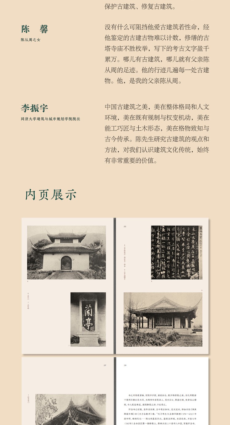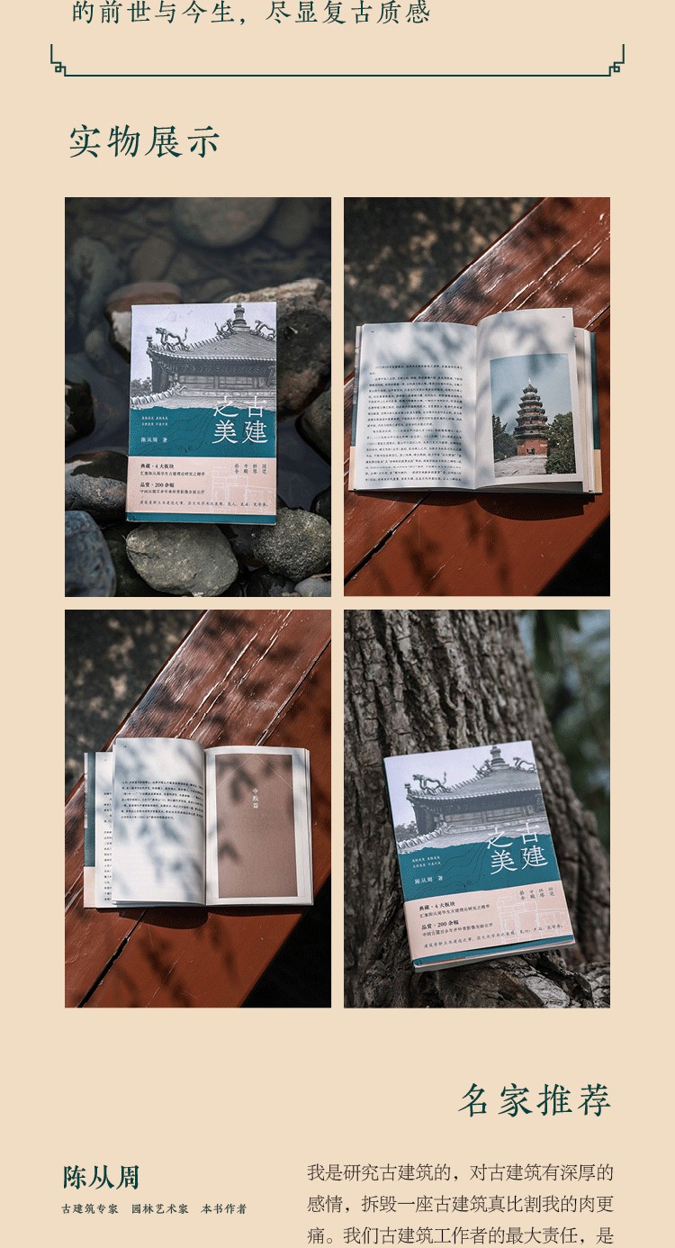 本書是我國有名古建築、古園林專家陳從周先生的古建築理論力作,匯集了陳從周先生畢生考察、研究、評估古建築的精華文章。 全書依建築類型分為園宅篇、橋塔篇、寺殿篇、拾餘篇四個板塊,隨文配有200餘幅珍貴歷史照片與手繪圖,以及後人補拍的現攝圖片、博物館 珍藏的古建名畫等,可作為建築藝術的典藏讀本。 文章既涉及陳從週對中國數十個代表性古建築的詳細考察,同時又對中國古建築的工藝、技法、特徵、研究與保護等進行了多方面的介紹和分析,還特別收錄了作者在走訪 檢視研究古建築過程中寫下的兼具知識與個人情趣的文章。 本書挑選出所有關於古建築品賞的經典篇目,集中呈現了我國的古建之美,展示了陳從周先生關於古建研究所寫作的所有名篇。