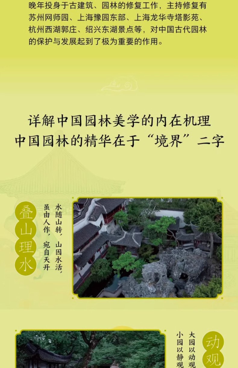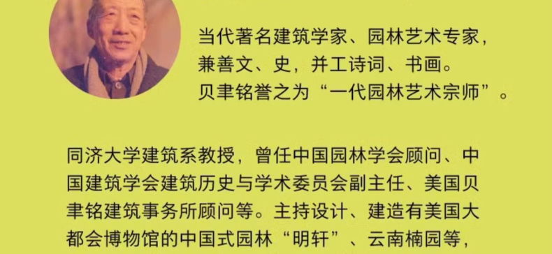 陳從周(1918—2000),晚年別號梓室,自稱梓翁。 中國有名古建築學家、園林藝術學家,現代中國園林學開創者、奠基者。 曾任同濟大學教授、博導。 現代中國庭園藝術集大成者,被建築大師貝聿銘譽為「一代園林宗師」。 擅長文、史,其作品文筆清麗,熔中國文史哲藝和古建園林於一爐。 兼工詩詞、繪畫,為張大千先生的入室弟子。 著有作品《說園》《蘇州園林》《中國名園》等。