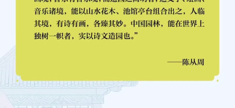 "★一代園林藝術宗師陳從周名文精選陳從周,當代有名建築學家、園林藝術專家,兼善文、史,並工詩詞、書畫,建築大師貝聿銘譽之為“一代園林藝術宗師”。一生 致力於園林與古建築的保護與修復,曾主持設計、建造有美國大都會博物館的中國式園林「明軒」、雲南楠園等,主持修復有蘇州網師園、上海豫園東部、杭州西湖郭 莊等。★細解中國園林美學的內在機理,提出中國園林的精華在於「意境」二字疊山理水、栽花移木、借景漏景、動觀靜觀……透過這本書,真正了解 中國庭園美學的內在機理,識得園林真面目。造園亦言 「......