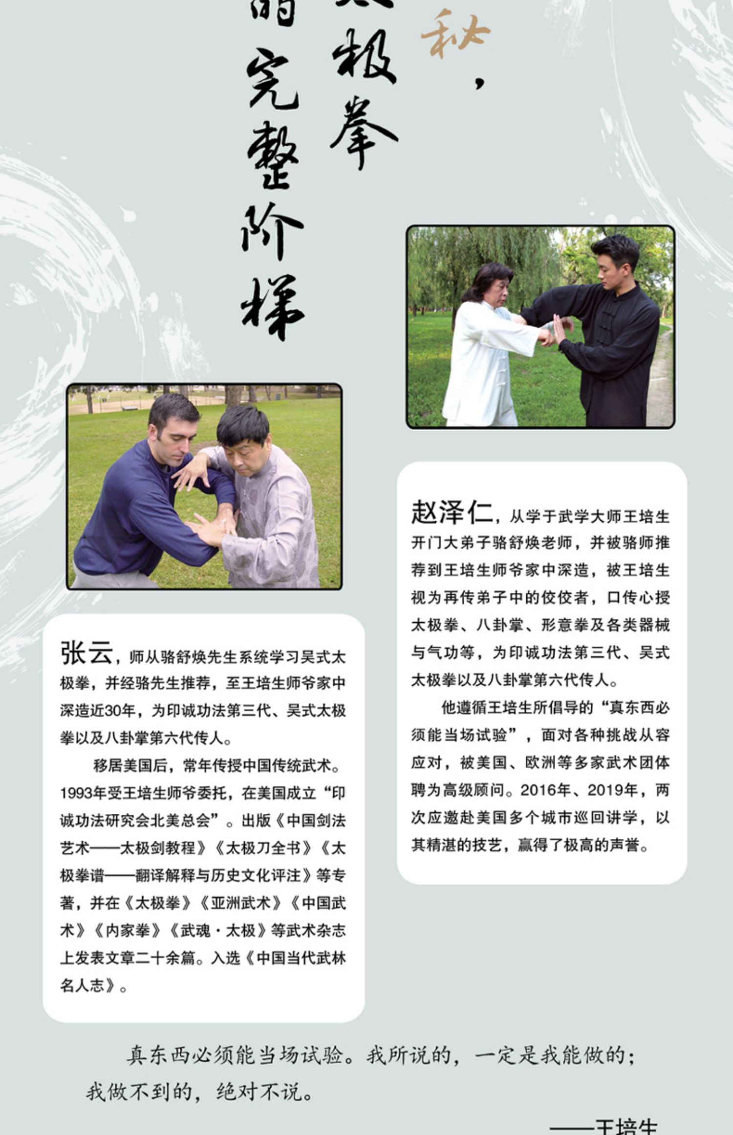 一部2019年即將問世的百科全書式的煌煌巨著。趙澤仁、張雲兩位作者盡得武學大師王培生先生真傳,拳術散手刀槍劍棍,無所不精;視野見聞實戰,堪稱一時之選。此書從經驗中昇華出智慧,披露太極門中三口不說、六耳不傳奧義,展示精修拳藝數十年的獨得之秘,詳解從入門到大成的太極各階段功夫,“字字真切義無遺”,提要鉤玄,體用兼備,是太極拳著作中之作。