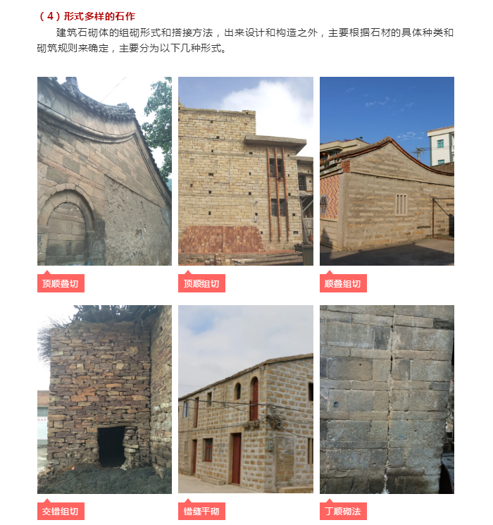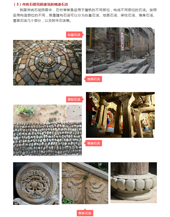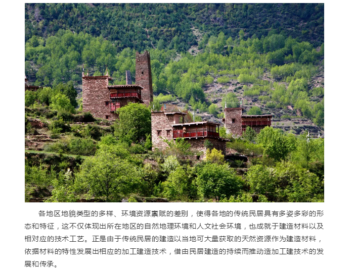 石質材料運用於民居建築的建造,在全國各地均有廣泛的分佈,與各地的自然地理環境及就地取材的材料特性有著密切的關聯,由此形成了與不同石質材料相對應的多樣化加工和建造技術。由於石材堅固耐久且具有就地取材、適地適用的便利,而有著悠久的歷史並構成了各地豐富多彩的建造文化。