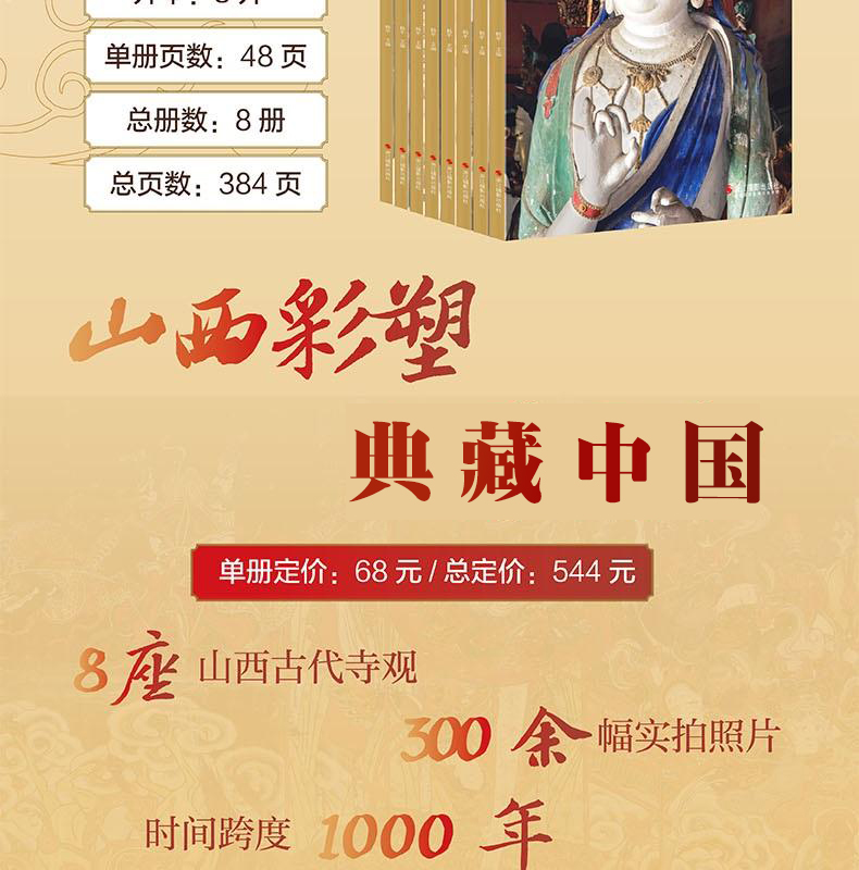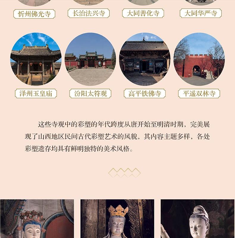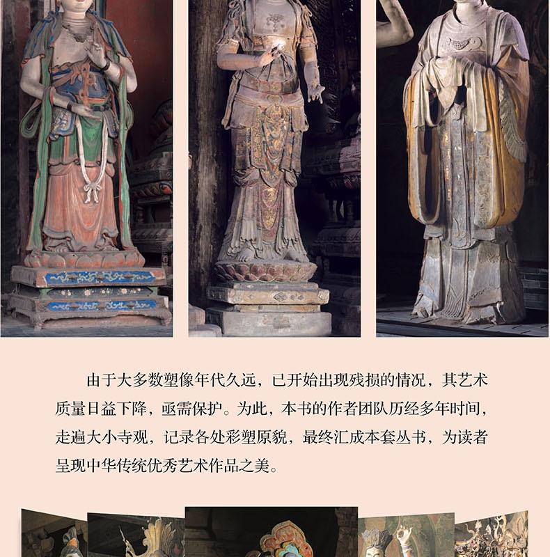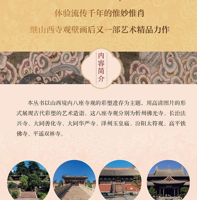 本叢書以山西境內10座古寺的壁畫遺存為主題,分別為雷城永樂宮、繁對峙公主寺、繁對峙岩山寺、汾陽聖母廟、高平開化寺、洪洞水神廟、稷山青龍寺 、靈丘覺山寺、朔州崇福寺、新綿稷益廟。 這些壁畫繪製的年代跨度從北宋至明朝,完美展現了山西地區民間古代繪畫藝術的風貌,其內容主題多樣,各處遺存均具有獨特的美術風格,此次選取的具有代表性的畫作均限度 地保留原畫的樣貌,可作為珍貴的美術史料供讀者鑑賞,使讀者得以從高清還原的影像中一窺中國傳統藝術之美。