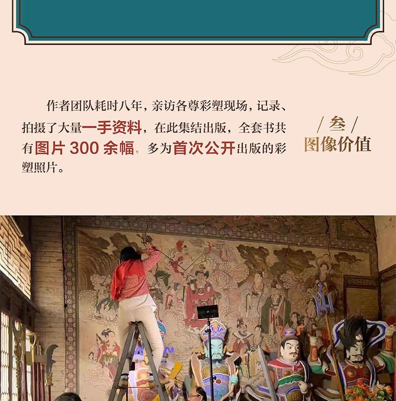 山 西是文化省份,也是文物大省,「地下文物看陝西,地上文物看山西。」山西省內保有中國現存面積的寺觀壁畫。 這些壁畫是中華民族傳統藝術的璀璨明珠,凝聚著我國古代勞動人民對美好生活的嚮往和偉大的創造力,在中國藝術史上佔據十分重要的地位。 山西寺觀壁畫從唐代開始,延續至清末,從中可以一窺中國美術史,具有極高的文化價值、學術價值和藝術價值。 而且,這些壁畫除了分佈在山西城鎮外,多數處於偏僻的山間鄉野,考察難度相當大,再加上歷經千百年的風雨侵蝕與動盪,許多壁畫不斷剝落、損毀,亟待修復和保護。 作者團隊克服千難萬險,歷時8年走遍山西各座寺廟,搶救性地拍攝了數十萬幅照片,只為留下山西壁畫行將逝去的精美絕倫。