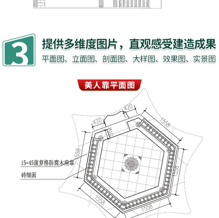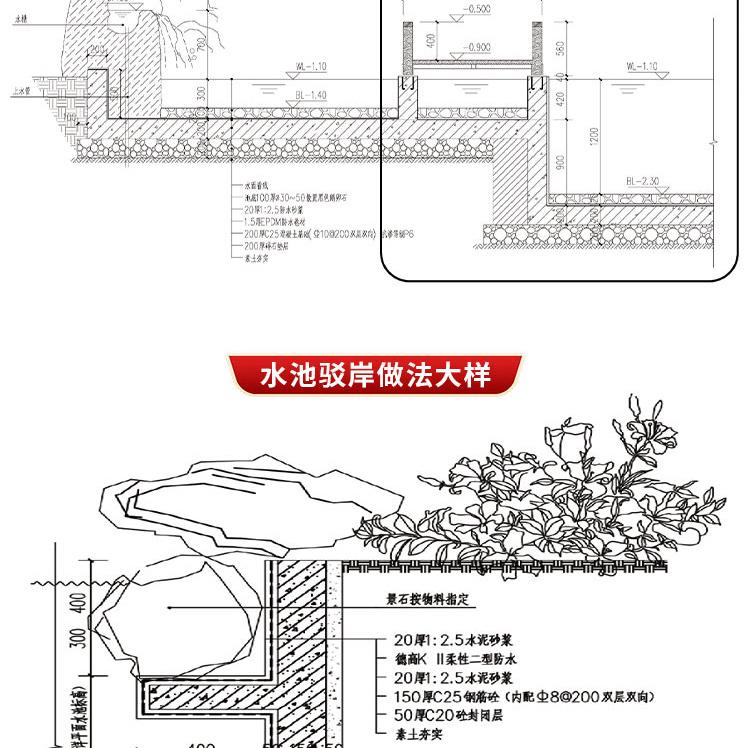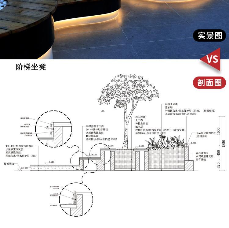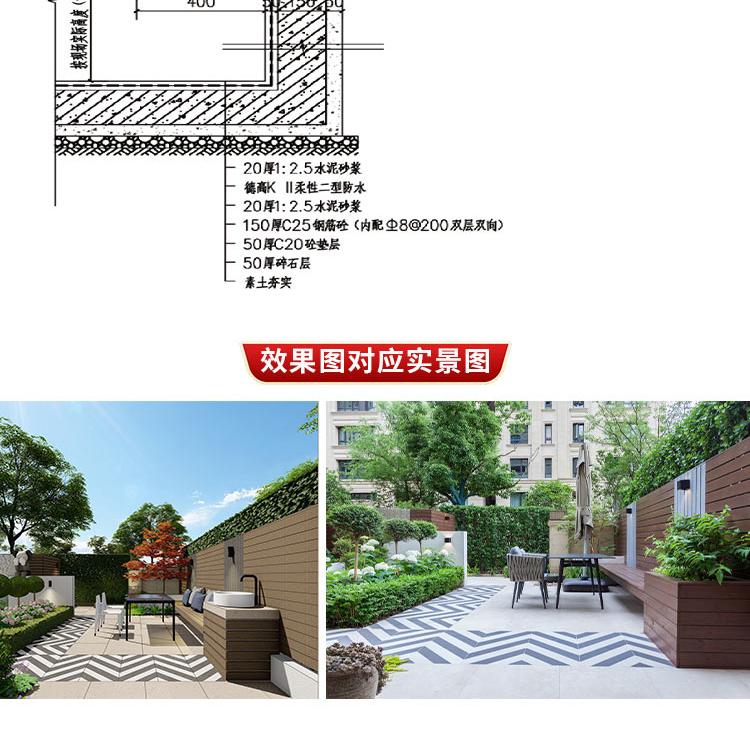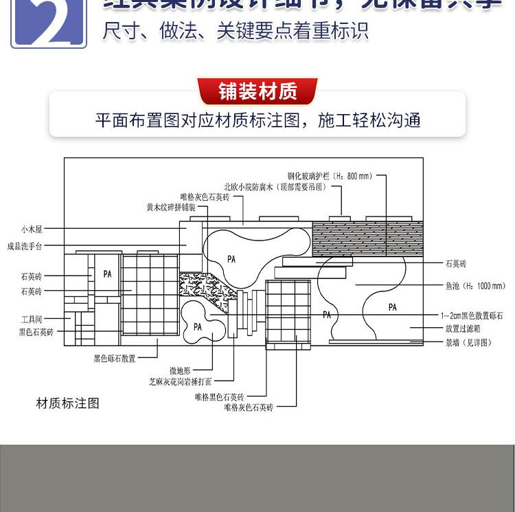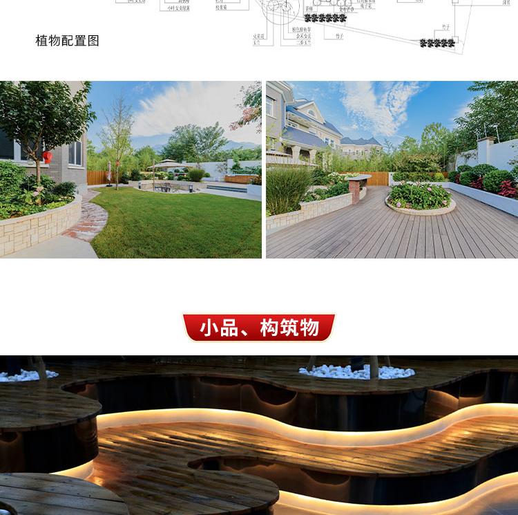 3. 每套方案中,既有花園面積、工程造價、施工週期等詳細信息,也有平面、立面、剖面、節點和大樣的多方位展示,還有鋪裝材質、植物配置、小品、構築物 和水電處理的具體參數,應有盡有。