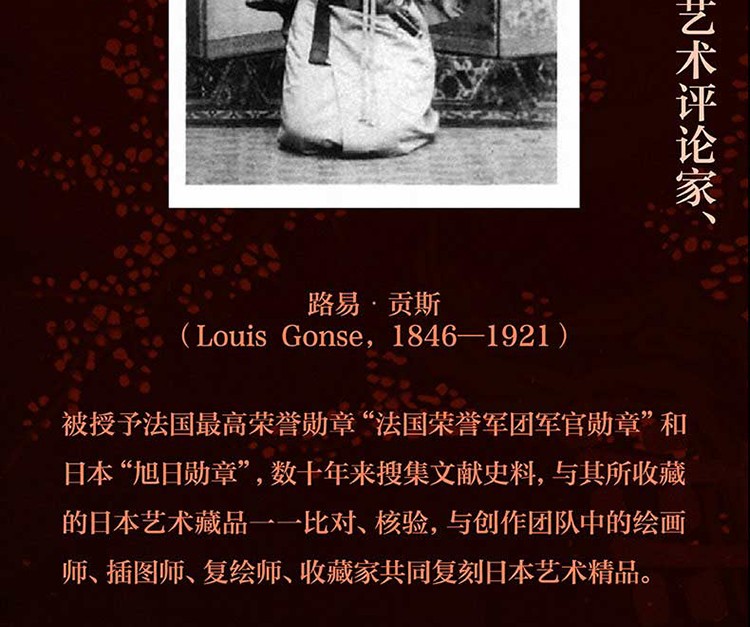 "1.一部“歐洲收藏的日本美術史”,世界範圍內第一部日本美術通史著作20世紀之前西方了解日本美術史的最佳途徑。法文版曾五次再版,1891年、1893 年英文 版和日文版相繼問世,本書在研究日本藝術領域具有先驅性貢獻。2. 法文原版(全兩卷) 首次以中文出版本書以1883年法文首版譯出。譯者增加大量註釋。3 . 19 世紀有名法國藝術評論家、收藏家的經典著作作者貢斯被授予法國優選榮譽勳章“法國榮譽軍團軍官勳章”和日本“旭日勳章”,數十年來蒐集文獻史料,與其所收藏的日本藝術藏品一 一比等