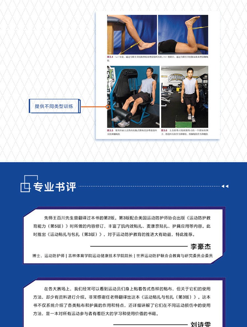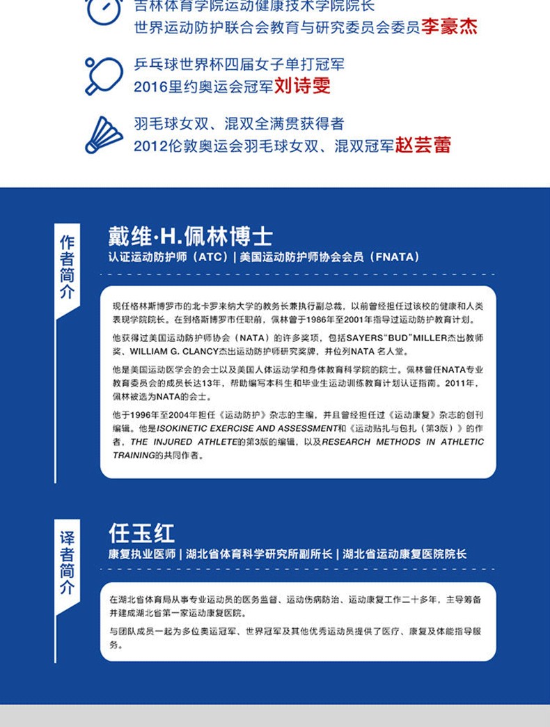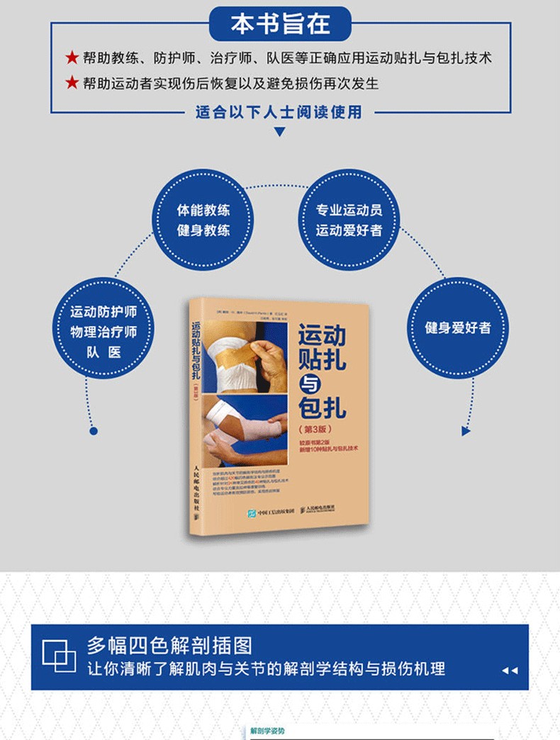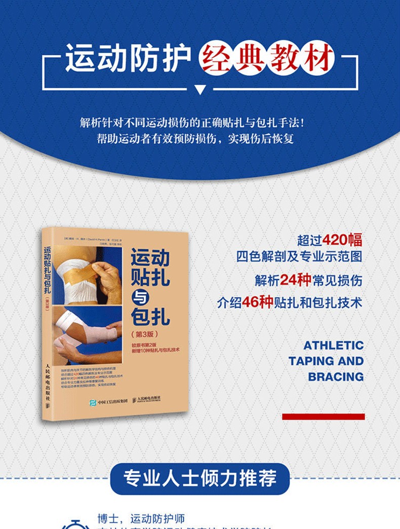 運動貼紮概述了貼紮、包紮與石膏、夾板固定技術的基礎知識,包括解剖學知識、循證實踐、作用、所使用的材料和準備工作等;然後通過專業示範圖片和分步驟文字講解,介紹了足部、踝關節、小腿、膝關節、大腿、髖部、骨盆、肩部、上臂、肘關節、前臂、腕關節與手部等主要身體部位的常見運動損傷的貼紮、包紮與石膏、夾板固定技術,以及各部位的解剖結構、損傷原理及有益恢復的伸展、肌力訓練等內容。本書旨在幫助教練、物理治療師、隊醫等掌握和應用正確的貼紮、包紮與石膏、夾板固定技術,並以此協助運動員進行傷後恢復及避免損傷再次發生。