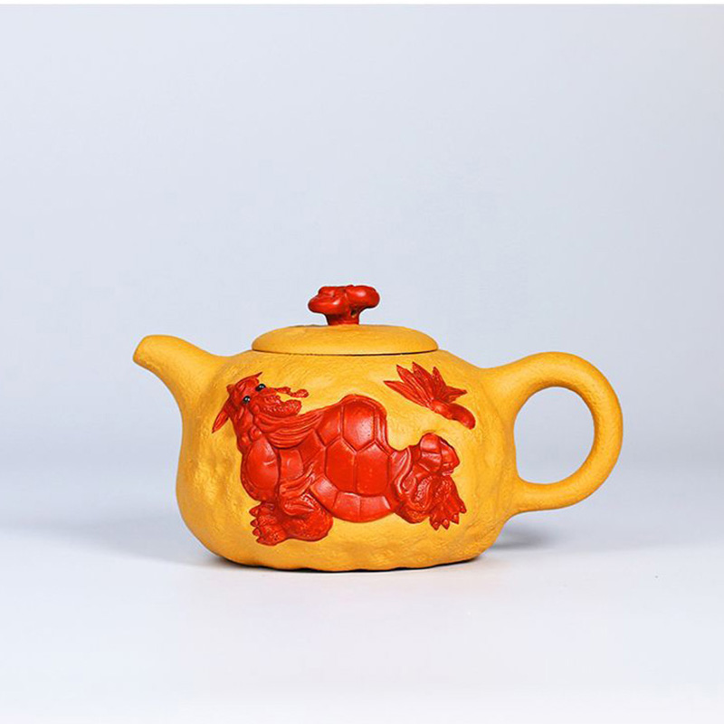 【宜興紫砂】原礦高黑泥描金 臥龍祥雲貔貅壺(260cc)破損免費補寄