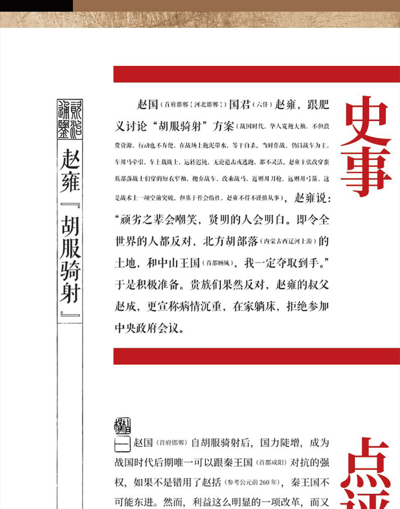 趙國(首府邯鄲)自胡服騎射後,國力陡增,成為戰國後期唯一可以跟秦王國(鹹陽)對抗的強權,如果不是錯用了趙括(參考公元前260 年),秦王國不可能 東進。 然而,利益這麼明顯的改革,卻不傷害任何人的既得利益,都這麼困難。 停滯的力量,似乎永遠超過進步的力量,正是中國人苦難的源頭。