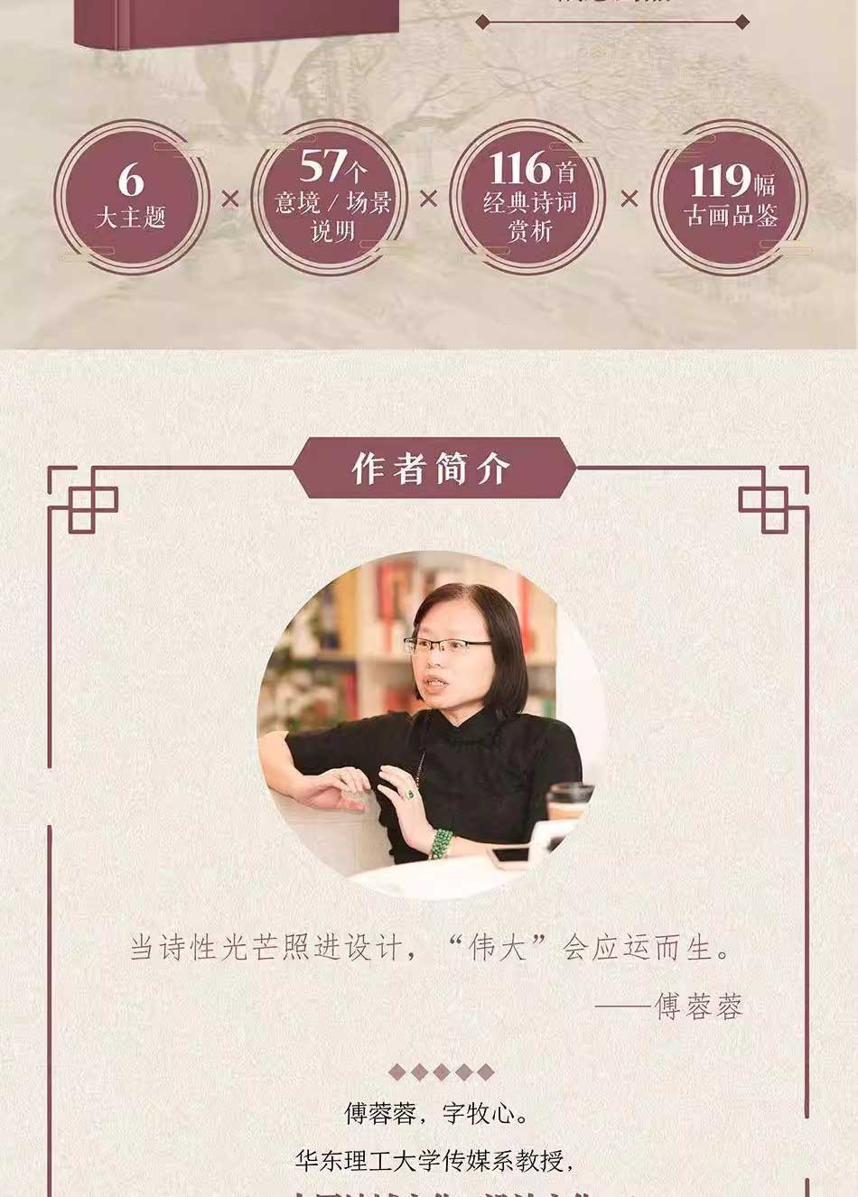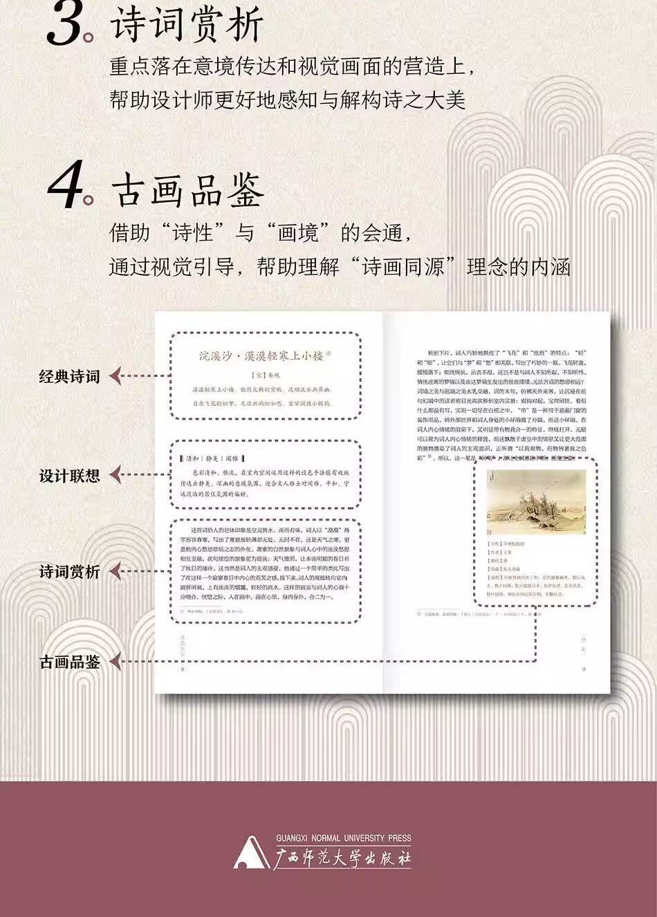結合中國傳統藝術理論,幫助設計師確立對中國詩詞空間之美構成要素的認知1. 設計師需要不斷的刺激和觸發,因此觸類旁通的體驗非常重要。詩詞意境的體驗對於設計師來說如同外出采風,可以給予設計師瞬間情感迸發的來源;2. 唐之明月,宋之楓紅。詩人看過的煙雲物色與今天設計師看到的有著“不同之同”,作者便是通過解讀詩詞幫助設計師去理解這種“同”;3. 為年輕設計師提供多元文化的滋養,使其設計倆年更加豐富、立體;4. 詩詞作為與設計不同的藝術種類,為成熟設計師提供了“陌生化體驗”,幫助其擺脫固有思路和框架。