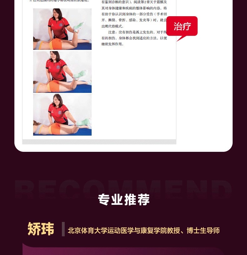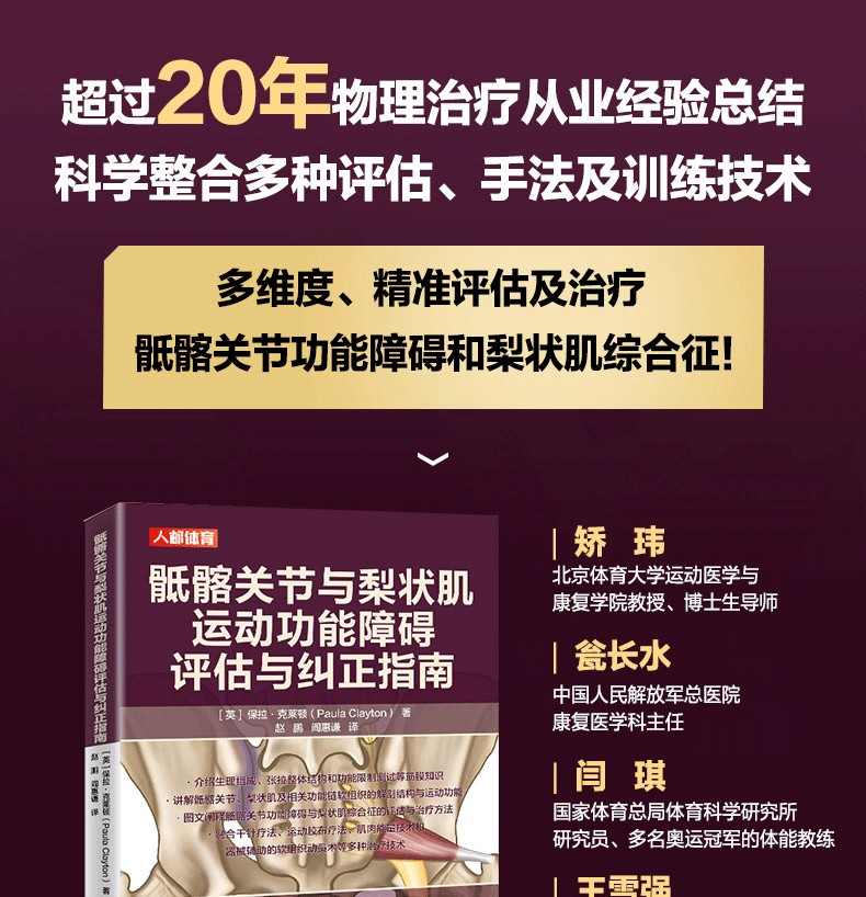 20多年物理治 療從業經驗總結,體能訓練及運動康復專業人士推薦 ·介紹生理組成、張拉整體結構、功能測試和治 療注意事項等筋膜知識 ·講解骶髂關節、梨狀肌及相關功能鏈軟組織的解剖結構與運動功能 ·圖文展示骶髂關節功能障礙和梨狀肌綜合徵的評估與治 療方法 ·融合多種評估方法與治 療技術 ——評估方法:步態評估、神經動力學評估、運動功能評估、肌肉長度及力量評估、疼痛評估和動作模式評估等 ——治 療技術:幹針療法、運動膠布療法、肌肉能量技術、軟組織放鬆技術、器械輔助的軟組織動員術等