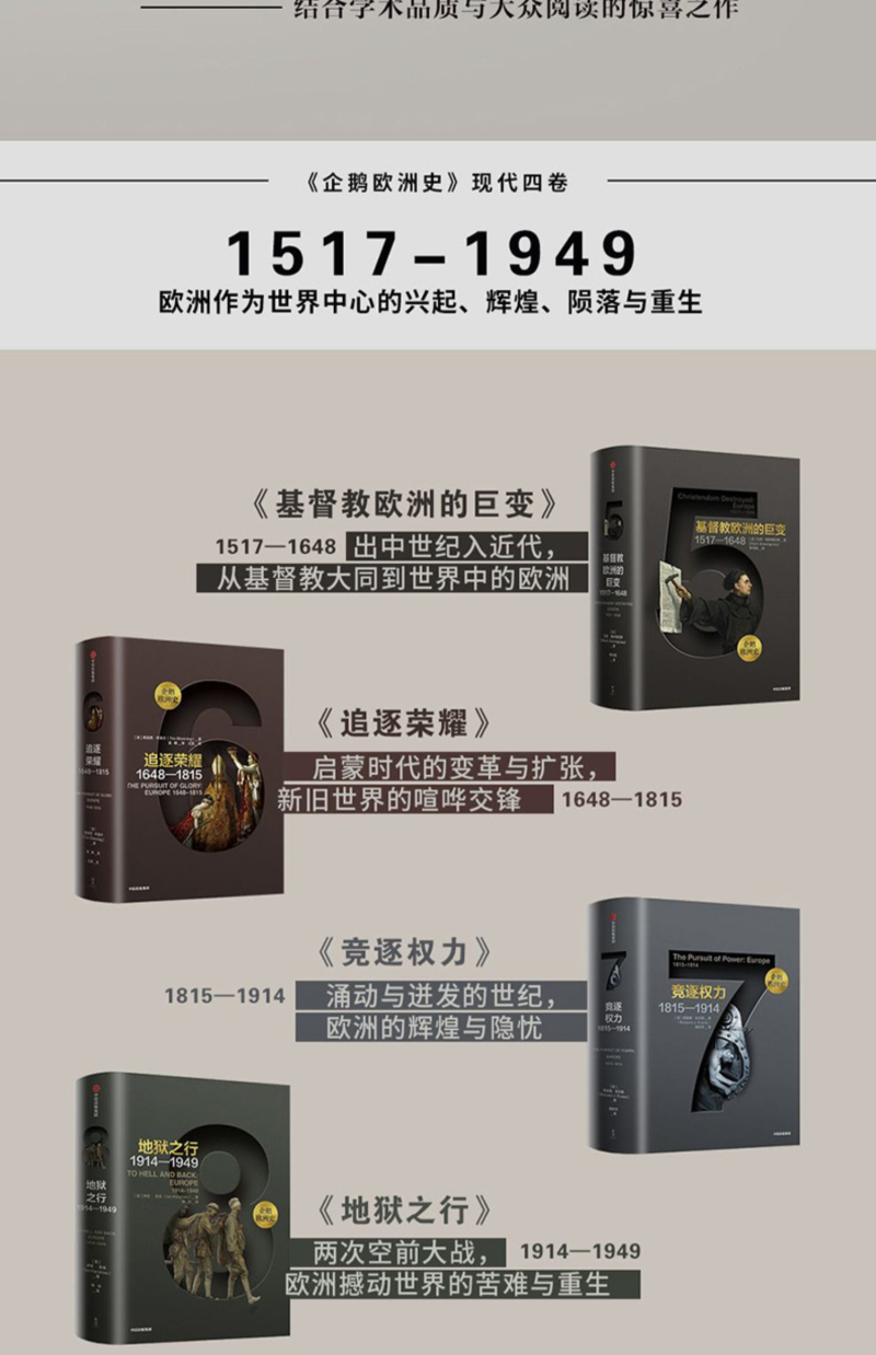 2.為歷史研究與寫作設立新基準的史詩巨制,結合學術品質與大眾閱讀的之作為「企鵝歐洲史」系列執筆的九位享譽世界的歐洲史學者,分別任教於牛津大學、劍橋大學、謝菲爾德大學、普林斯頓大學等知名學府,其中多位具有英國歷史學會會員、英國國家學術院院士的身份。他們以在各自領域深耕數十年的累積與見地,在歷史學界眾多研究成果的基礎上,用獨特的謀篇佈局、明晰的主線,傳達出對各段歷史的認識,描畫出歐洲近四千年演進歷程背後的動力。史家的責任與學養使他們書寫的歷史可靠、可信,而他們合力撰寫的「企鵝歐洲史」系列,又是面向大眾的寫作。摒棄學術體例和學界行話,用閃爍著洞見的敘述,將歷史的洪流與涓流、大小人物的境遇和事件的發端及餘波編織到一起,連綴成各個歷史時期的全景圖。透過主線把握發展大勢,用細節與時人共情,帶出有興味、有樂趣、有衝擊、有所得的閱讀體驗。如此寫作,讓讀者不需要學術背景,也能從學術共同體多年來研究、思辨的成果中獲益;不需要復雜的知識儲備,就能直接進入歷史,看歐洲如何改變世界,又被世界改變。