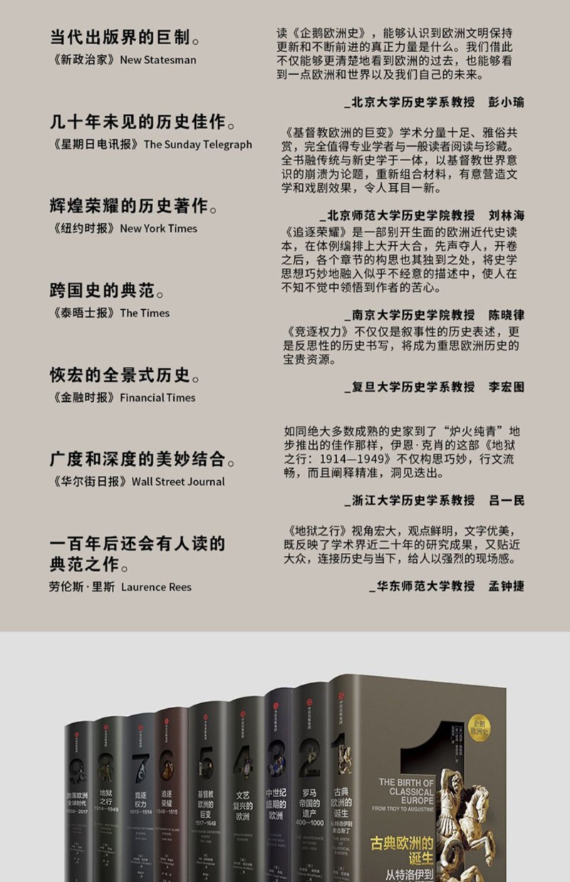 4. 歐美主流媒體力薦:透過這套書,才能讀懂歐洲! 2004年,「企鵝歐洲史」系列的開篇作、普林斯頓大學威廉•喬丹的《中世紀盛期的歐洲》問世,被譽為這一出版界巨制的恢宏開篇。自那以來的十多年中,「企鵝歐洲史」系列備受期待,每有新作推出,無不大受讚賞,不僅在學界廣受推崇,還深得大眾認可,獲得《-》《金融時報》年度好書、《星期日泰晤士報》年度歷史書等多項讚譽,被視為“代表學術精神的典範”,“彷彿站在奧林匹斯山上俯瞰近代歐洲的歷史”,“一百年後還會有人讀”,“幾十年未見的歷史佳作”。透過這套書,才能讀懂歐洲。