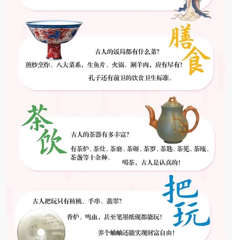 甄選古人茶飲、把玩、家居、膳食、服飾五大領域。