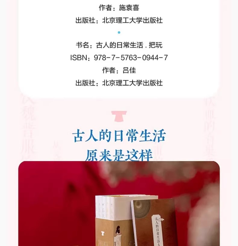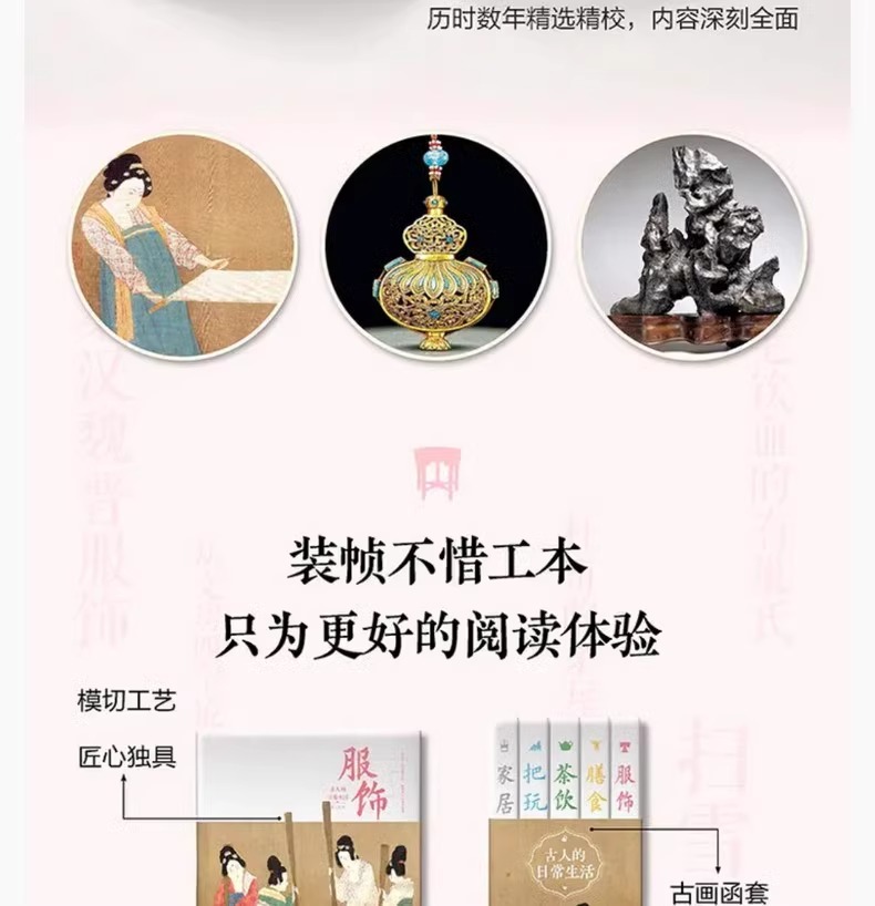 「古人的日常生活書系」在中國傳統文化「衣食住行」的基礎上,從古人精緻的把玩生活、古人服飾的精華與衍變、古人「意在物外」的茶飲藝術、古人家居建築美學、 古人日常膳食中選取了數百個與日常生活息息相關的話題,從言行舉止到鍋碗瓢盆,從園林宅居到收藏雅玩,有趣的文字搭配上千幅高清插圖,集實用與審美雙重功能 ,全方位展現古人日常生活的傳承與變遷。