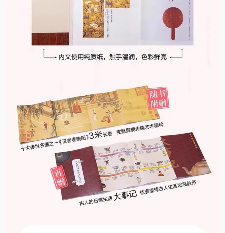 附贈珍藏於台北故宮博物院,中國十大傳世名畫之一、中國「重彩仕女長卷」《漢宮春曉圖》3米長卷,完整展現傳統藝術精粹。