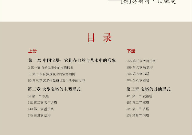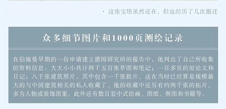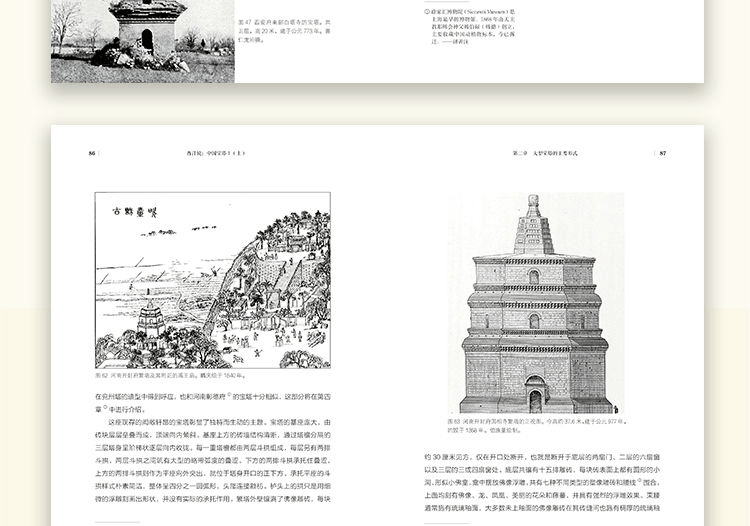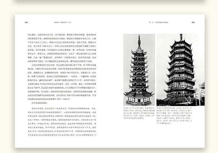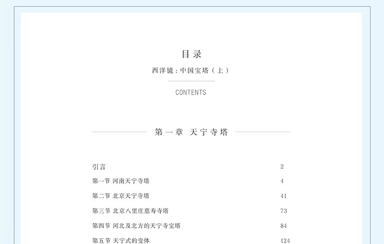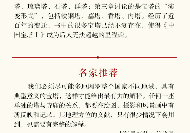 本書是西方 早期系統研究中國寶塔的著作,初版於1931年,收錄了520張插圖和照片、27萬餘字考察報告。 全書共分三章, 章整理了寶塔的定義、歷史,簡單介紹了自然風光、藝術作品和日常生活中的寶塔範例。 第二、三章依照寶塔的體積、材質、結構、用途等將寶塔細分為十二類:第二章呈現了“大型寶塔”的“主要形式”,包括級塔、天寧方塔、 疊層 塔、層塔、外廊層塔、琉璃塔、石塔、群塔;第三章討論的是寶塔的“演化形式”,包括鐵銅塔、墓塔、香塔、內塔。 經歷了近百年的變遷,書中的許多寶塔已經不復存在,使得《中國寶塔Ⅰ》成為後人 的里程碑。