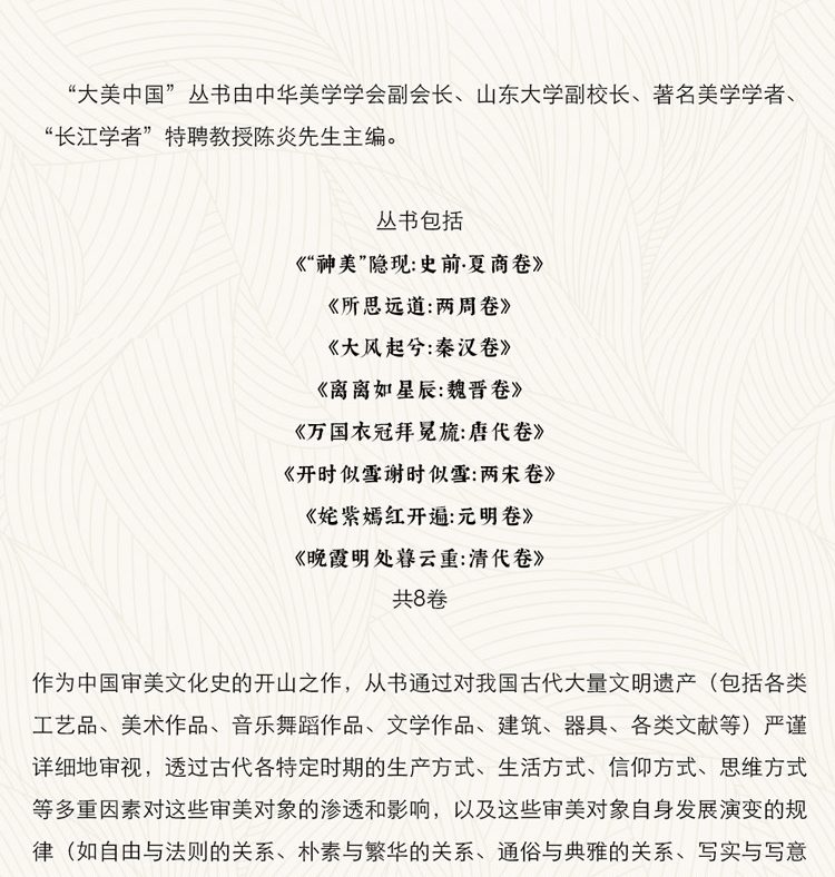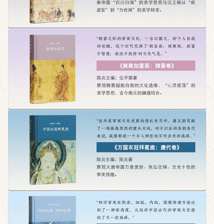 《萬國衣冠拜冕旒:唐卷》全書通過對我大唐帝國時期大量文明遺產(包括各類工藝品、美術作品、音樂舞蹈作品、文學作品、建築、器具、各類文獻等)嚴謹詳細地審視,透過生產方式、生活方式、信仰方式、思維方式等多重因素對這些審美對象的滲透和影響,以及這些審美對象自身發展演變的規律的考察和研究,為我們清晰地展現和勾勒出中國魏晉審美文化史的演進軌跡。全書文字通暢易懂,並配以大量精美插圖,從而大大降低了接受難度。