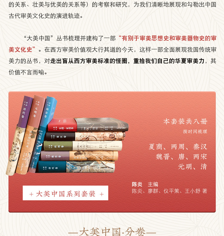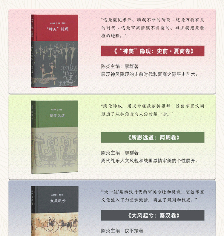 《神美隱現:史前˙夏商卷》全書通過對我國史前大量文明遺產(包括各類工藝品、美術作品、音樂舞蹈作品、文學作品、建築、器具、各類文獻等)嚴謹詳細地審視,透過生產方式、生活方式、信仰方式、思維方式等多重因素對這些審美對象的滲透和影響,以及這些審美對象自身發展演變的規律的考察和研究,為我們清晰地展現和勾勒出中國秦漢審美文化史的演進軌跡。全書文字通暢易懂,並配以大量精美插圖,從而大大降低了接受難度。