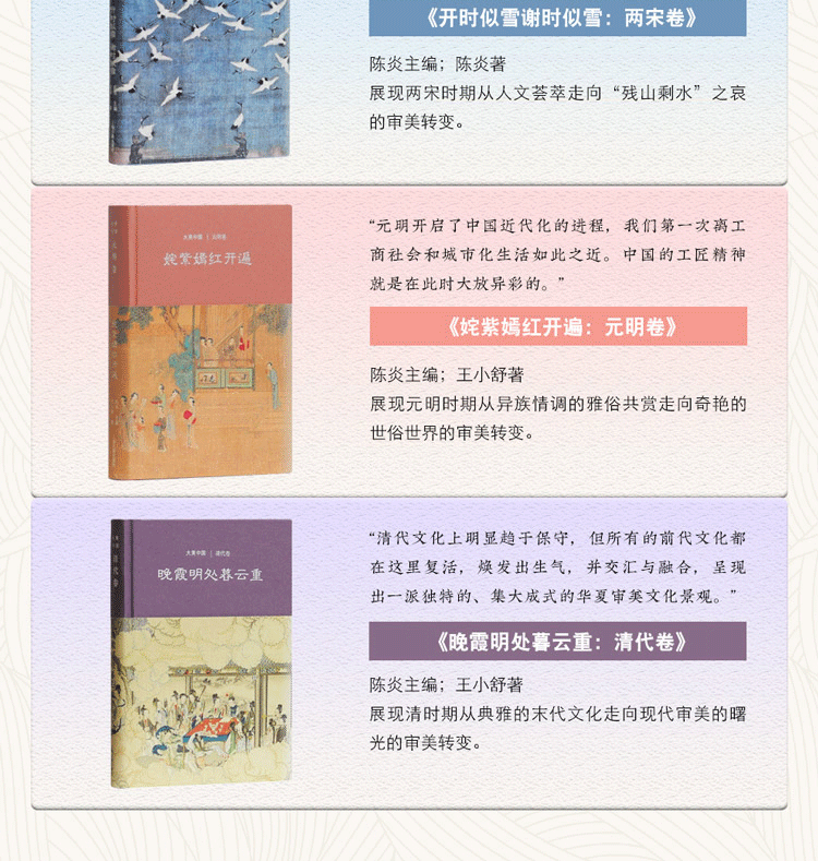 《開時似雪謝時似雪:兩宋卷》全書通過對我國古代大量文明遺產嚴謹詳細地審視,透過古代各特定時期生活方式、信仰方式、思維方式等多重因素對這些審美對象的滲透和影響,以及這些審美對象自身發展演變的的規律的考察和研究,為我們清晰地展現和勾勒出中國