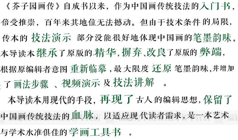 《芥子園畫傳》自成書以來,作為中國畫傳統技法的入門書,倍受推崇,百年來其地位無法撼動。 但由於技術條件的限制,傳本的技法示範部分未能很好地體現中國畫的筆墨韻味。 本導讀本繼承了原版的精華,摒棄、改良了原版的弊端,根據原編輯者意圖重新臨摹,限度還原筆墨韻味,並增加了畫法步驟、視頻演示及技法講解。 本導讀本用現代的手段,再現了古人的編輯思想,保留了中國畫傳統技法的血脈,以適應現代讀者需求,是一本藝術與學術水準俱佳的學畫工具書。