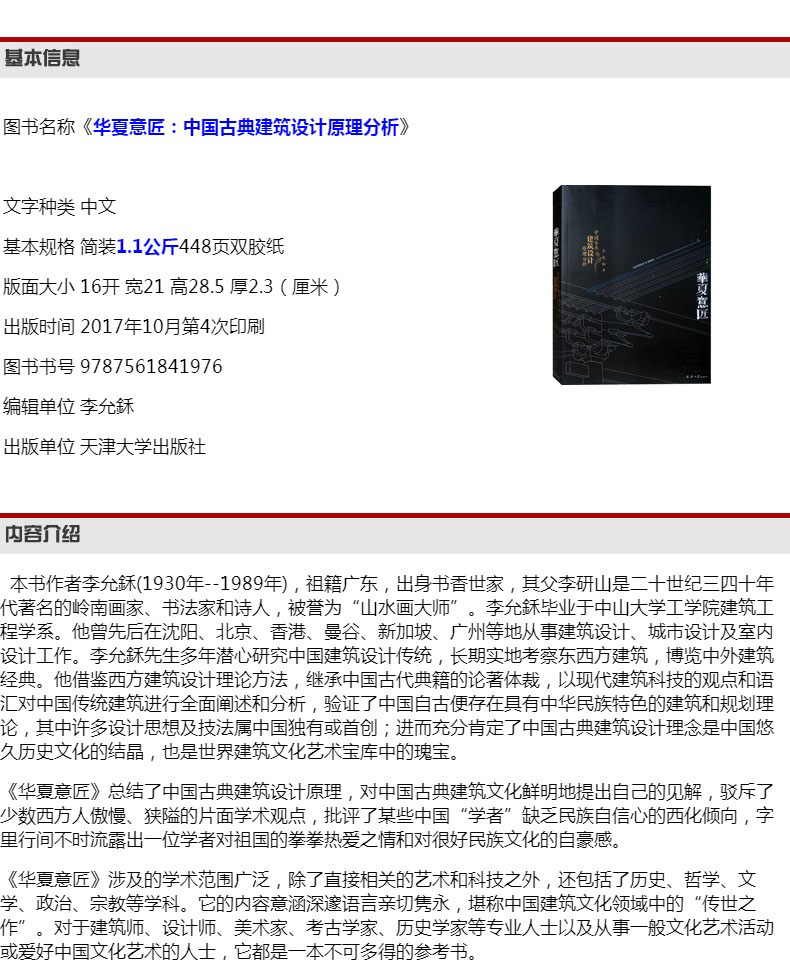 李允鉌先生多年潛心研究中國建築設計傳統,長期實地考察東西方建築,博覽中外建築經典。他借鑒西方建築設計理論方法,繼承中國古代典籍的論著體裁,以現代建築科技的觀點和語彙對中國傳統建築進行全面闡述和分析,驗證了中國自古便存在具有中華民族特色的建築和規劃理論,其中許多設計思想及技法屬中國獨有或**,在世界都居於地位;進而充分肯定了中國古典建築設計理念是中國悠久歷史文化的結晶,也是世界建築文化藝術寶庫中的瑰寶。