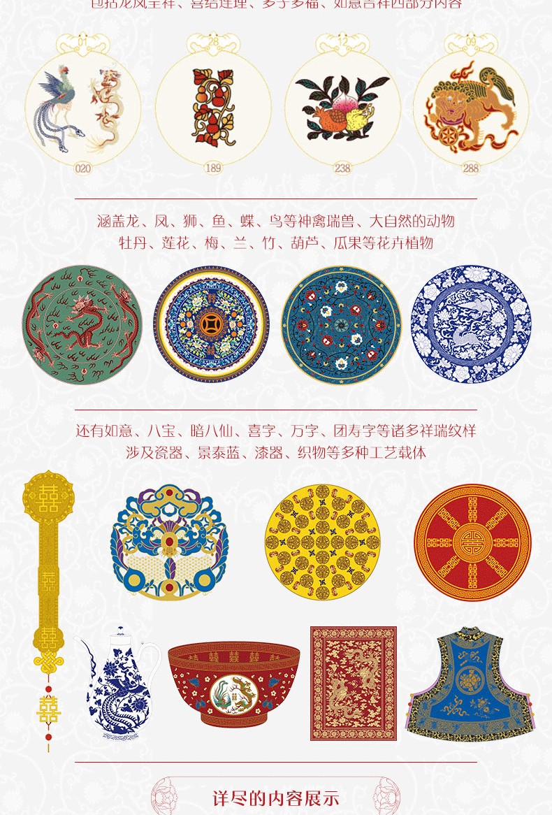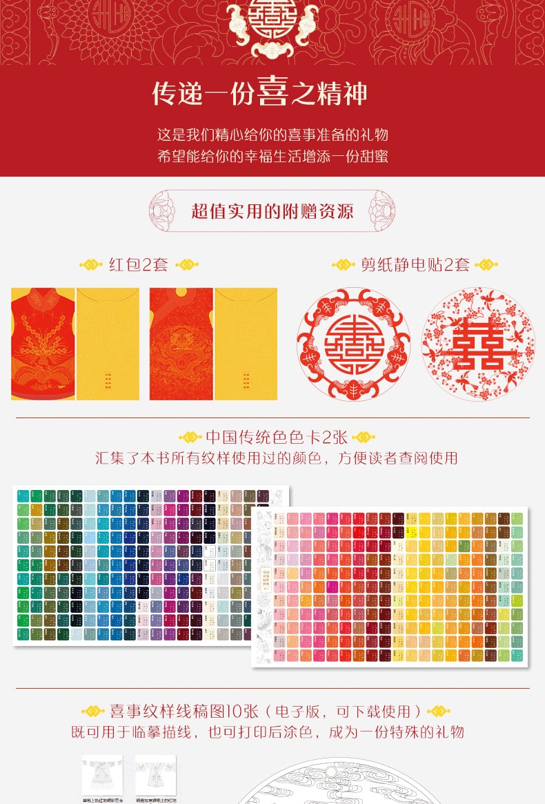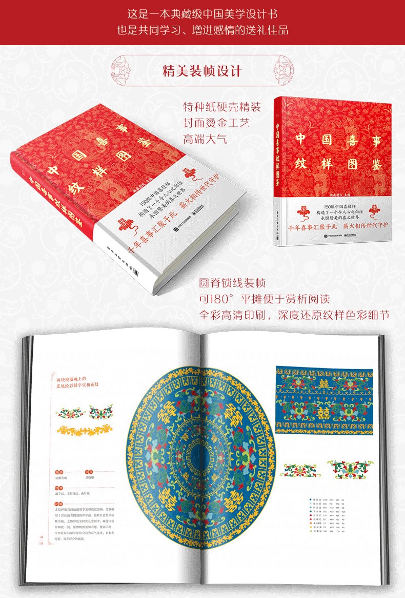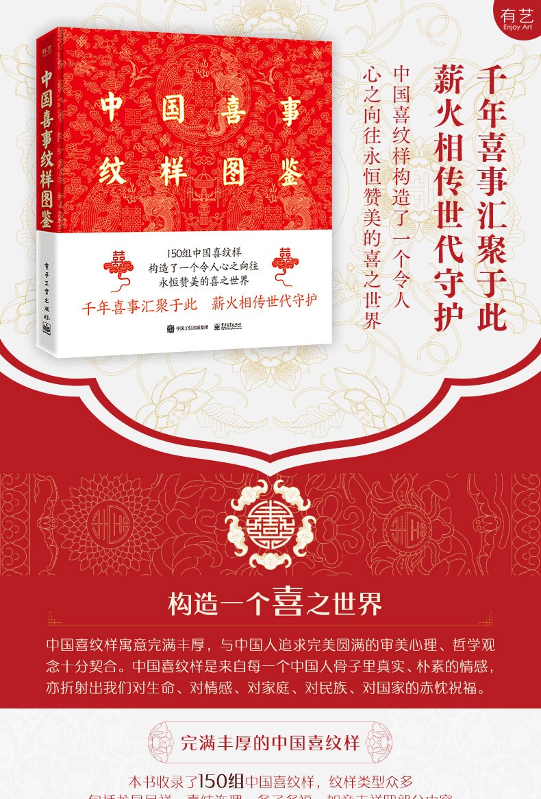 本書收錄了150組中國喜紋樣,紋樣類型眾多,包括龍鳳呈祥、喜結連理、多子多福、如意吉祥四部分內容。 涵蓋龍、鳳、獅、魚、蝶、鳥等神禽瑞獸、大自然的動物,牡丹、蓮花、梅、蘭、竹、葫蘆、瓜果等花卉植物,還有如意、八寶、暗八仙 、喜字、萬字、團壽字等諸多祥瑞紋樣。 涉及瓷器、景泰藍、漆器、織物等多種工藝載體。 本書每一種紋樣都提煉出載體、年代、紋樣和寓意,並配上由紋藏團隊繪製的紋樣向量圖、線圖、單獨紋樣和色板,便於讀者更清晰地理解和使用。 本書適合中國傳統文化愛好者、藝術從業者和設計師閱讀。