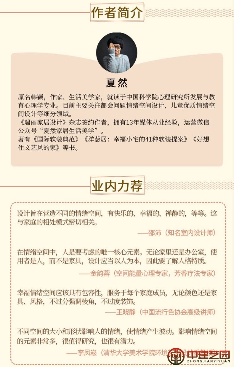理學專業。常年進行建築藝術、室內設計、跨界元素與情緒、心理、社會問題的研究與探索。目前主要關注都會問題情緒空間設計、兒童優質情緒空間設計以及正向情緒空間設計等細分領域。擁有13 年的媒體經驗,為《瑞麗家居設計》雜誌簽約作者。營運的公眾號「夏然家居生活美學」(aixiaran)以關註生活方式、情緒與空間的關係為宗旨。發表了《藏家:物所集結的世界》《共享家:找回缺失的自我》《以萌寵之名療癒愛》《留白:家的喚醒模式》等多篇文章。著有《國際軟裝典範》《洋蔥居:幸福小宅的41 種軟裝提案》《好想住文藝風的家》等。她認為好的設計者應習得正面的情緒技法,讓每個空間都「心領神會」。